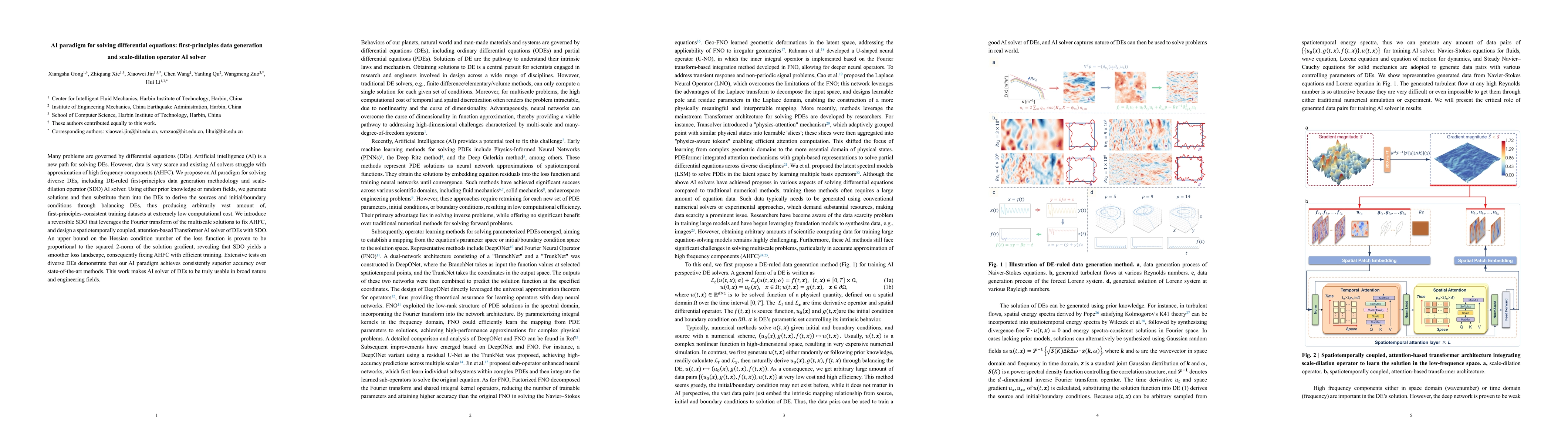Many problems are governed by differential equations (DEs). Artificial intelligence (AI) is a new path for solving DEs. However, data is very scarce and existing AI solvers struggle with approximation of high frequency components (AHFC). We propose an AI paradigm for solving diverse DEs, including DE-ruled first-principles data generation methodology and scale-dilation operator (SDO) AI solver. Using either prior knowledge or random fields, we generate solutions and then substitute them into the DEs to derive the sources and initial/boundary conditions through balancing DEs, thus producing arbitrarily vast amount of, first-principles-consistent training datasets at extremely low computational cost. We introduce a reversible SDO that leverages the Fourier transform of the multiscale solutions to fix AHFC, and design a spatiotemporally coupled, attention-based Transformer AI solver of DEs with SDO. An upper bound on the Hessian condition number of the loss function is proven to be proportional to the squared 2-norm of the solution gradient, revealing that SDO yields a smoother loss landscape, consequently fixing AHFC with efficient training. Extensive tests on diverse DEs demonstrate that our AI paradigm achieves consistently superior accuracy over state-of-the-art methods. This work makes AI solver of DEs to be truly usable in broad nature and engineering fields.