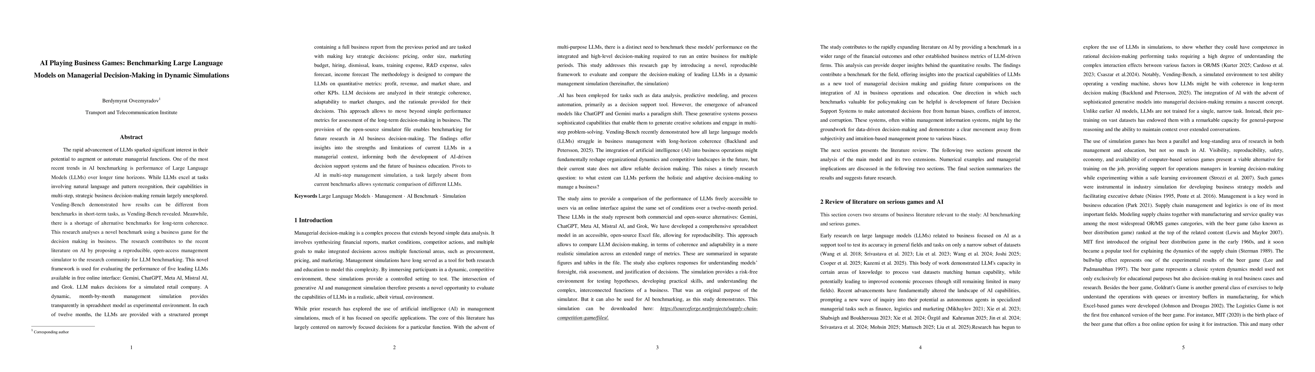 The rapid advancement of LLMs sparked significant interest in their potential to augment or automate managerial functions. One of the most recent trends in AI benchmarking is performance of Large Language Models (LLMs) over longer time horizons. While LLMs excel at tasks involving natural language and pattern recognition, their capabilities in multi-step, strategic business decision-making remain largely unexplored. Few studies demonstrated how results can be different from benchmarks in short-term tasks, as Vending-Bench revealed. Meanwhile, there is a shortage of alternative benchmarks for long-term coherence. This research analyses a novel benchmark using a business game for the decision making in business. The research contributes to the recent literature on AI by proposing a reproducible, open-access management simulator to the research community for LLM benchmarking. This novel framework is used for evaluating the performance of five leading LLMs available in free online interface: Gemini, ChatGPT, Meta AI, Mistral AI, and Grok. LLM makes decisions for a simulated retail company. A dynamic, month-by-month management simulation provides transparently in spreadsheet model as experimental environment. In each of twelve months, the LLMs are provided with a structured prompt containing a full business report from the previous period and are tasked with making key strategic decisions: pricing, order size, marketing budget, hiring, dismissal, loans, training expense, R&D expense, sales forecast, income forecast The methodology is designed to compare the LLMs on quantitative metrics: profit, revenue, and market share, and other KPIs. LLM decisions are analyzed in their strategic coherence, adaptability to market changes, and the rationale provided for their decisions. This approach allows to move beyond simple performance metrics for assessment of the long-term decision-making.
