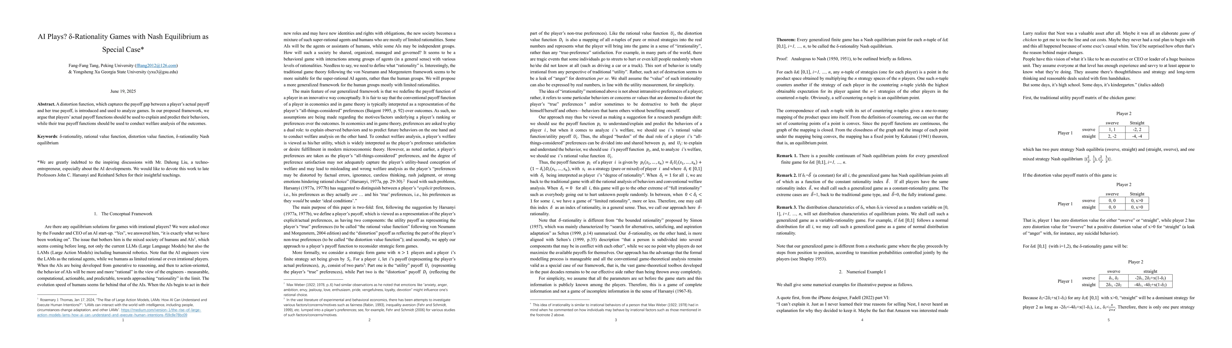 A distortion function, which captures the payoff gap between a player's actual payoff and her true payoff, is introduced and used to analyze games. In our proposed framework, we argue that players' actual payoff functions should be used to explain and predict their behaviors, while their true payoff functions should be used to conduct welfare analysis of the outcomes.