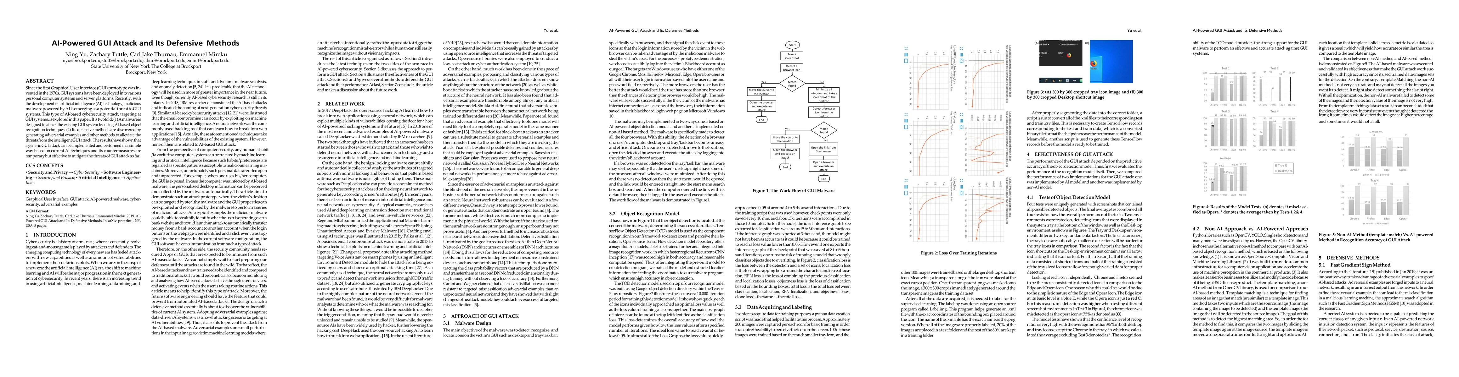 This paper explores AI-powered attacks on Graphical User Interfaces (GUIs) using AI-based object recognition techniques, and proposes defensive methods including adversarial examples to mitigate these threats. The study finds that while generic GUI attacks are feasible, current countermeasures are effective in reducing the risks.