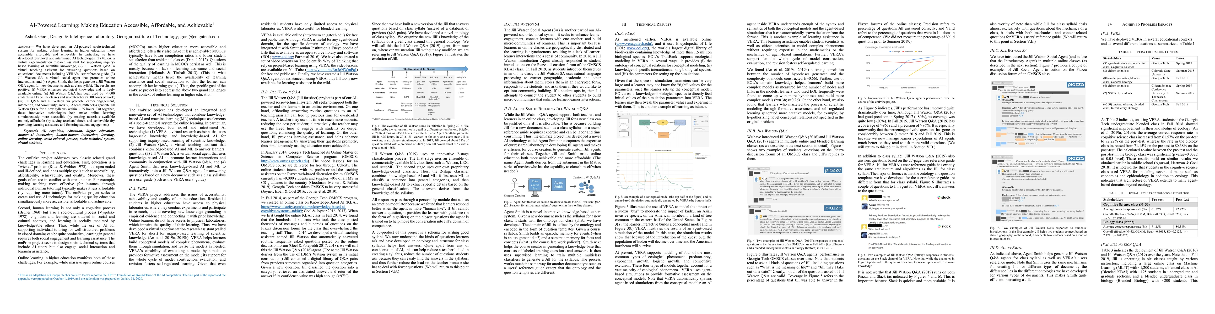 We have developed an AI-powered socio-technical system for making online learning in higher education more accessible, affordable and achievable. In particular, we have developed four novel and intertwined AI technologies: (1) VERA, a virtual experimentation research assistant for supporting inquiry-based learning of scientific knowledge, (2) Jill Watson Q&A, a virtual teaching assistant for answering questions based on educational documents including the VERA user reference guide, (3) Jill Watson SA, a virtual social agent that promotes online interactions, and (4) Agent Smith, that helps generate a Jill Watson Q&A agent for new documents such as class syllabi. The results are positive: (i) VERA enhances ecological knowledge and is freely available online; (ii) Jill Watson Q&A has been used by >4,000 students in >12 online classes and saved teachers >500 hours of work; (iii) Jill Q&A and Jill Watson SA promote learner engagement, interaction, and community; and (iv). Agent Smith helps generate Jill Watson Q&A for a new syllabus within ~25 hours. Put together, these innovative technologies help make online learning simultaneously more accessible (by making materials available online), affordable (by saving teacher time), and achievable (by providing learning assistance and fostering student engagement).