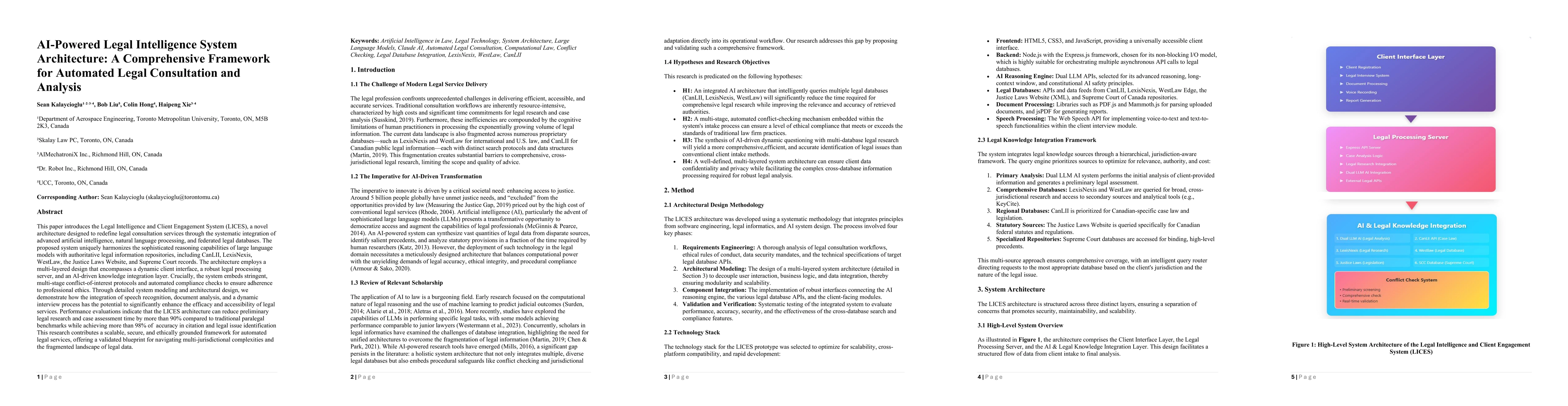 This paper introduces the Legal Intelligence and Client Engagement System (LICES), a novel architecture designed to redefine legal consultation services through the systematic integration of advanced artificial intelligence, natural language processing, and federated legal databases. The proposed system uniquely harmonizes the sophisticated reasoning capabilities of large language models with authoritative legal information repositories, including CanLII, LexisNexis, WestLaw, the Justice Laws Website, and Supreme Court records. The architecture employs a multi-layered design that encompasses a dynamic client interface, a robust legal processing server, and an AI-driven knowledge integration layer. Crucially, the system embeds stringent, multi-stage conflict-of-interest protocols and automated compliance checks to ensure adherence to professional ethics. Through detailed system modeling and architectural design, we demonstrate how the integration of speech recognition, document analysis, and a dynamic interview process has the potential to significantly enhance the efficacy and accessibility of legal services. Performance evaluations indicate that the LICES architecture can reduce preliminary legal research and case assessment time by more than 90% compared to traditional paralegal benchmarks while achieving more than 98% of accuracy in citation and legal issue identification This research contributes a scalable, secure, and ethically grounded framework for automated legal services, offering a validated blueprint for navigating multi-jurisdictional complexities and the fragmented landscape of legal data.