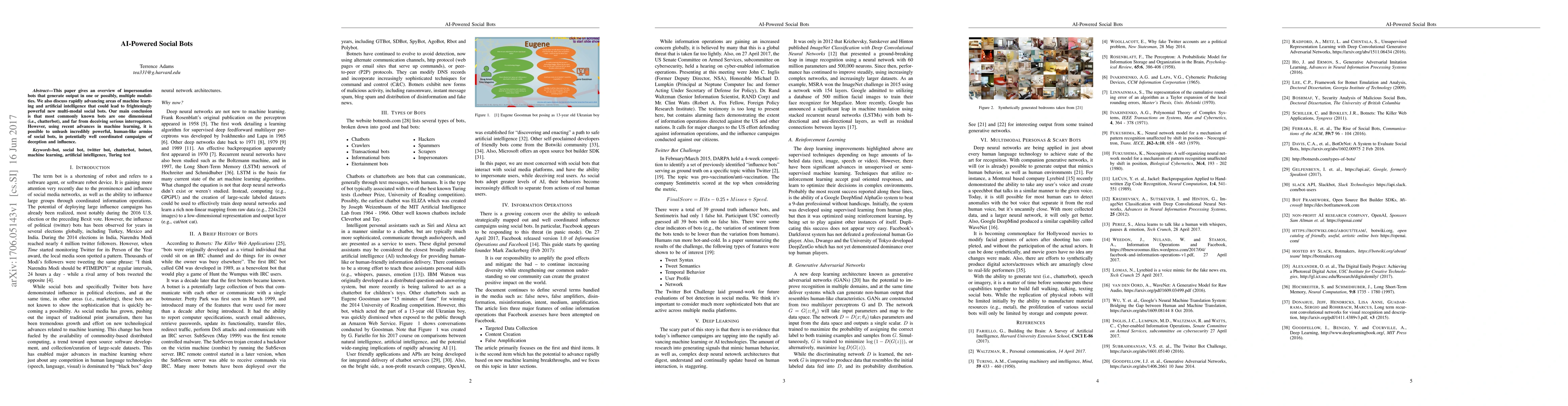 This paper reviews impersonation bots capable of generating output in multiple modalities, highlighting the potential of advanced machine learning to create powerful, deceptive social bots capable of coordinated influence campaigns. Despite current bots' limitations, recent AI advancements could enable highly convincing, multi-modal social bot armies.