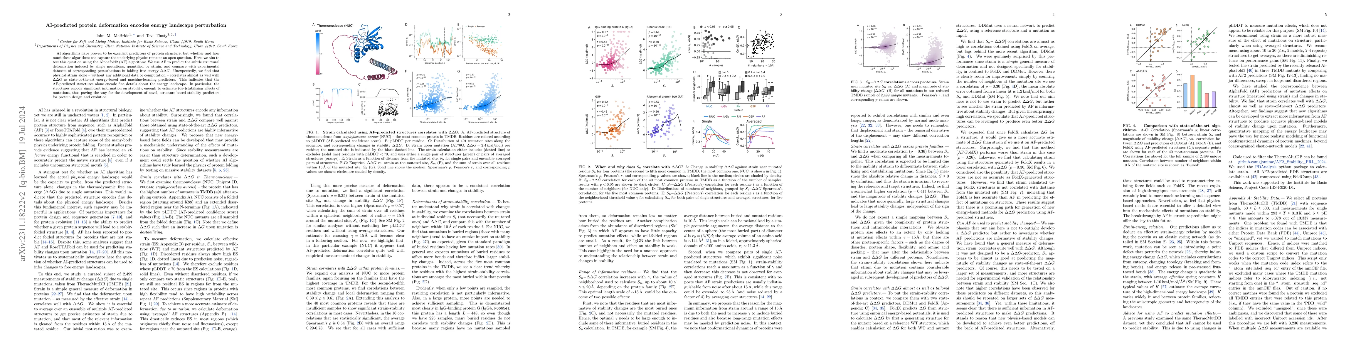 AI algorithms proved excellent predictors of protein structure, but whether their exceptional accuracy is merely due to megascale regression or these algorithms learn the underlying physics remains an open question. Here, we perform a stringent test for the existence of such learning in the Alphafold2 (AF) algorithm: We use AF to predict the subtle structural deformation induced by single mutations, quantified by strain, and compare with experimental datasets of corresponding perturbations in folding free energy $\Delta\Delta G$. Unexpectedly, we find that physical strain alone -- without any additional data or computation -- correlates almost as well with $\Delta \Delta G$ as state-of-the-art energy-based and machine-learning predictors.This indicates that the AF-predicted structures alone encode fine details about the energy landscape. In particular, the structures encode significant information on stability, enough to estimate (de-)stabilizing effects of mutations, thus paving the way for the development of novel, structure-based stability predictors for protein design and evolution.