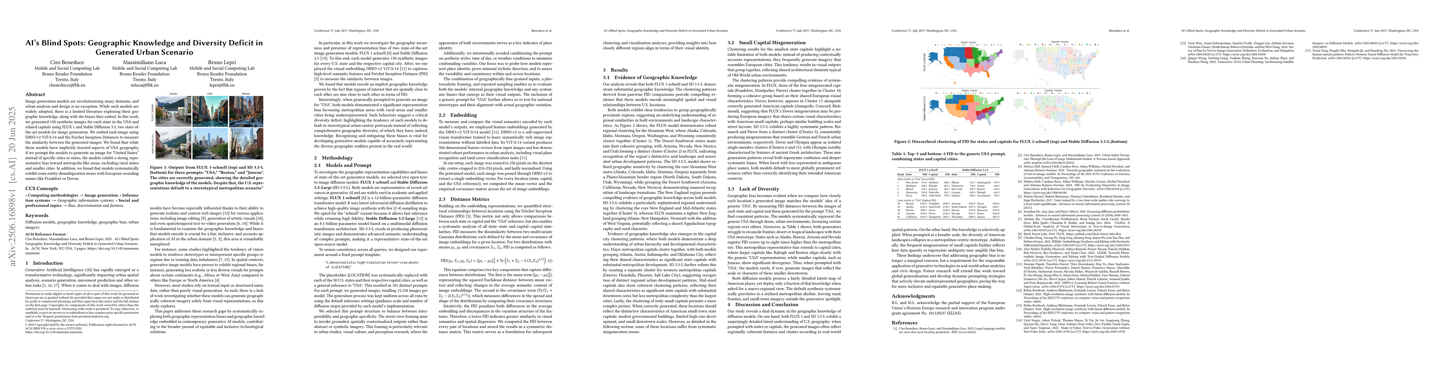 Image generation models are revolutionizing many domains, and urban analysis and design is no exception. While such models are widely adopted, there is a limited literature exploring their geographic knowledge, along with the biases they embed. In this work, we generated 150 synthetic images for each state in the USA and related capitals using FLUX 1 and Stable Diffusion 3.5, two state-of-the-art models for image generation. We embed each image using DINO-v2 ViT-S/14 and the Fr\'echet Inception Distances to measure the similarity between the generated images. We found that while these models have implicitly learned aspects of USA geography, if we prompt the models to generate an image for "United States" instead of specific cities or states, the models exhibit a strong representative bias toward metropolis-like areas, excluding rural states and smaller cities. {\color{black} In addition, we found that models systematically exhibit some entity-disambiguation issues with European-sounding names like Frankfort or Devon.