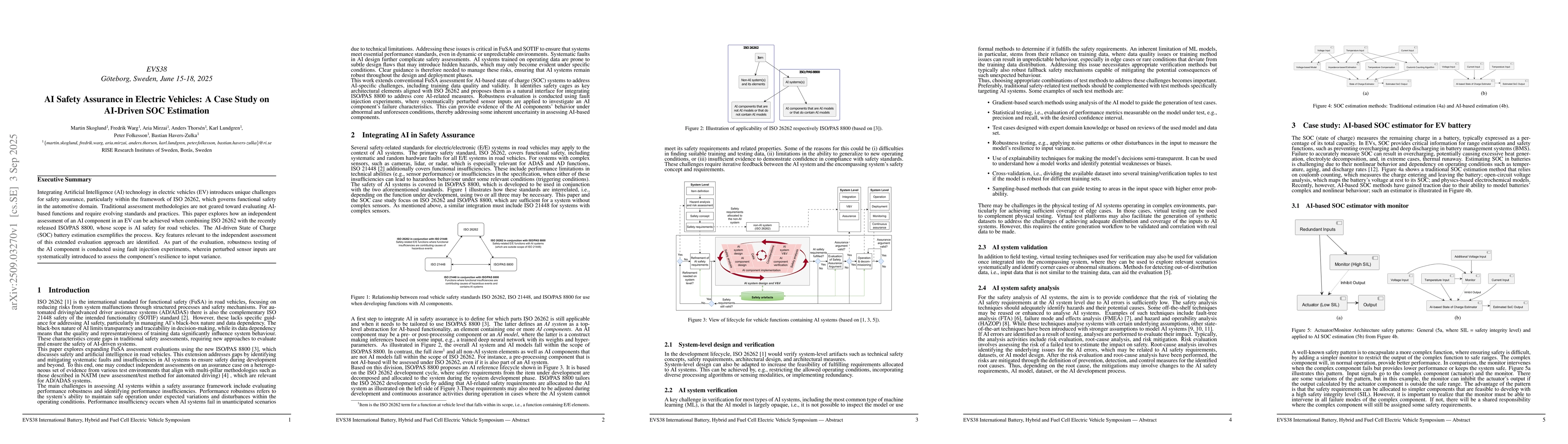 Integrating Artificial Intelligence (AI) technology in electric vehicles (EV) introduces unique challenges for safety assurance, particularly within the framework of ISO 26262, which governs functional safety in the automotive domain. Traditional assessment methodologies are not geared toward evaluating AI-based functions and require evolving standards and practices. This paper explores how an independent assessment of an AI component in an EV can be achieved when combining ISO 26262 with the recently released ISO/PAS 8800, whose scope is AI safety for road vehicles. The AI-driven State of Charge (SOC) battery estimation exemplifies the process. Key features relevant to the independent assessment of this extended evaluation approach are identified. As part of the evaluation, robustness testing of the AI component is conducted using fault injection experiments, wherein perturbed sensor inputs are systematically introduced to assess the component's resilience to input variance.