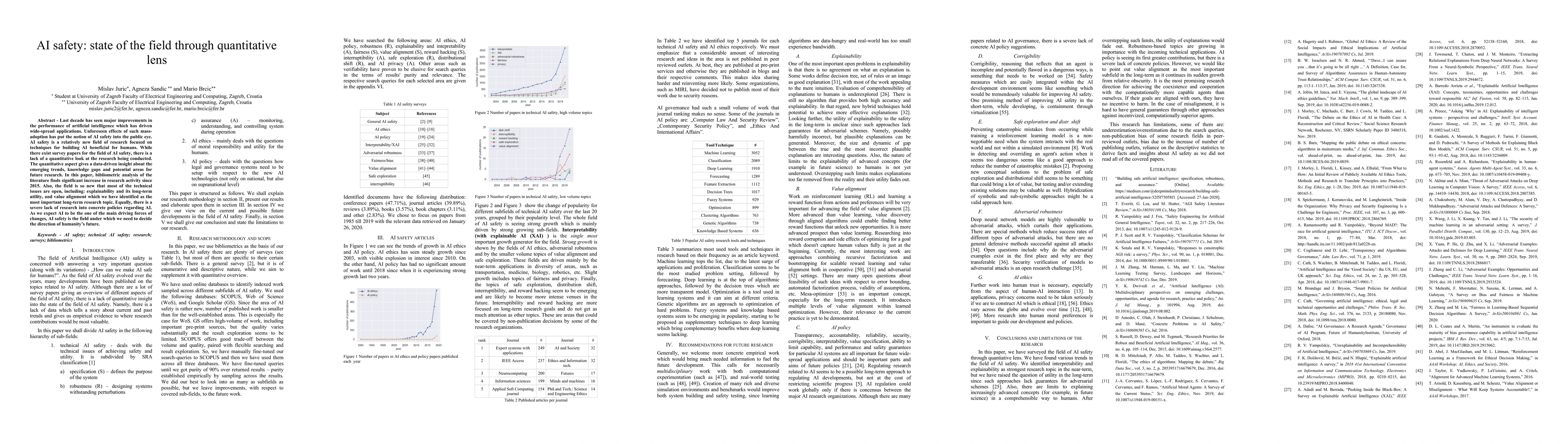 The paper provides a quantitative analysis of AI safety research, revealing significant growth in activity since 2015, with key gaps including explainability and policy development. These findings highlight the need for concrete policies to guide humanity's future as AI becomes increasingly influential.