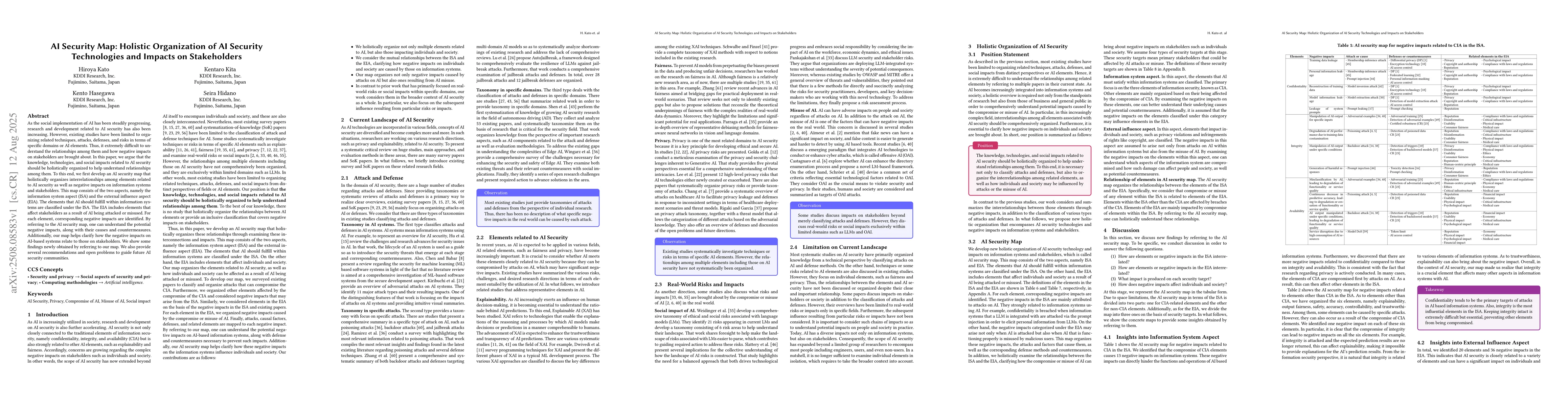 As the social implementation of AI has been steadily progressing, research and development related to AI security has also been increasing. However, existing studies have been limited to organizing related techniques, attacks, defenses, and risks in terms of specific domains or AI elements. Thus, it extremely difficult to understand the relationships among them and how negative impacts on stakeholders are brought about. In this paper, we argue that the knowledge, technologies, and social impacts related to AI security should be holistically organized to help understand relationships among them. To this end, we first develop an AI security map that holistically organizes interrelationships among elements related to AI security as well as negative impacts on information systems and stakeholders. This map consists of the two aspects, namely the information system aspect (ISA) and the external influence aspect (EIA). The elements that AI should fulfill within information systems are classified under the ISA. The EIA includes elements that affect stakeholders as a result of AI being attacked or misused. For each element, corresponding negative impacts are identified. By referring to the AI security map, one can understand the potential negative impacts, along with their causes and countermeasures. Additionally, our map helps clarify how the negative impacts on AI-based systems relate to those on stakeholders. We show some findings newly obtained by referring to our map. We also provide several recommendations and open problems to guide future AI security communities.
