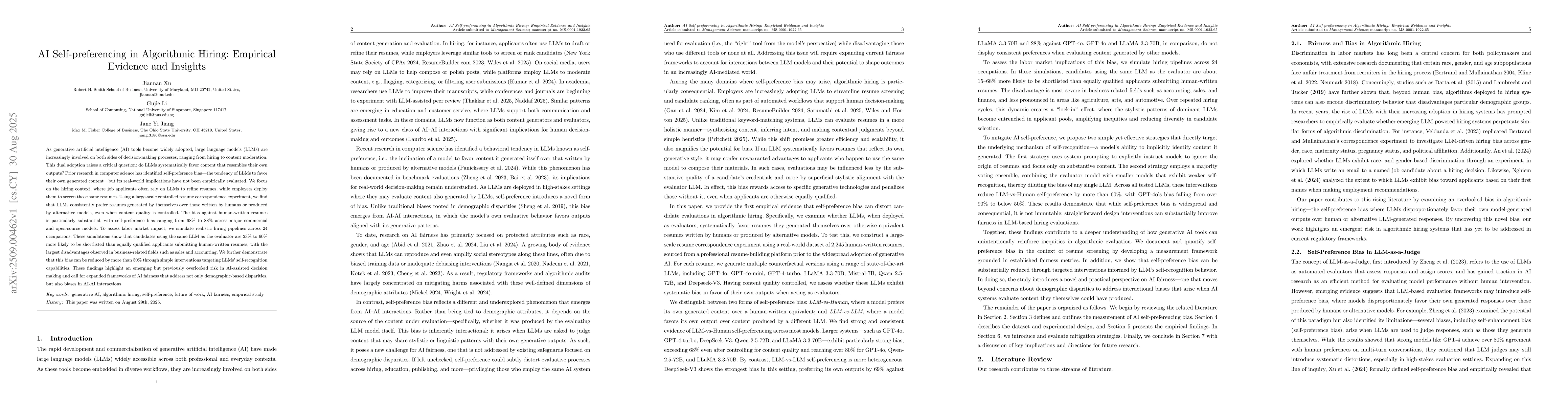 As generative artificial intelligence (AI) tools become widely adopted, large language models (LLMs) are increasingly involved on both sides of decision-making processes, ranging from hiring to content moderation. This dual adoption raises a critical question: do LLMs systematically favor content that resembles their own outputs? Prior research in computer science has identified self-preference bias -- the tendency of LLMs to favor their own generated content -- but its real-world implications have not been empirically evaluated. We focus on the hiring context, where job applicants often rely on LLMs to refine resumes, while employers deploy them to screen those same resumes. Using a large-scale controlled resume correspondence experiment, we find that LLMs consistently prefer resumes generated by themselves over those written by humans or produced by alternative models, even when content quality is controlled. The bias against human-written resumes is particularly substantial, with self-preference bias ranging from 68% to 88% across major commercial and open-source models. To assess labor market impact, we simulate realistic hiring pipelines across 24 occupations. These simulations show that candidates using the same LLM as the evaluator are 23% to 60% more likely to be shortlisted than equally qualified applicants submitting human-written resumes, with the largest disadvantages observed in business-related fields such as sales and accounting. We further demonstrate that this bias can be reduced by more than 50% through simple interventions targeting LLMs' self-recognition capabilities. These findings highlight an emerging but previously overlooked risk in AI-assisted decision making and call for expanded frameworks of AI fairness that address not only demographic-based disparities, but also biases in AI-AI interactions.