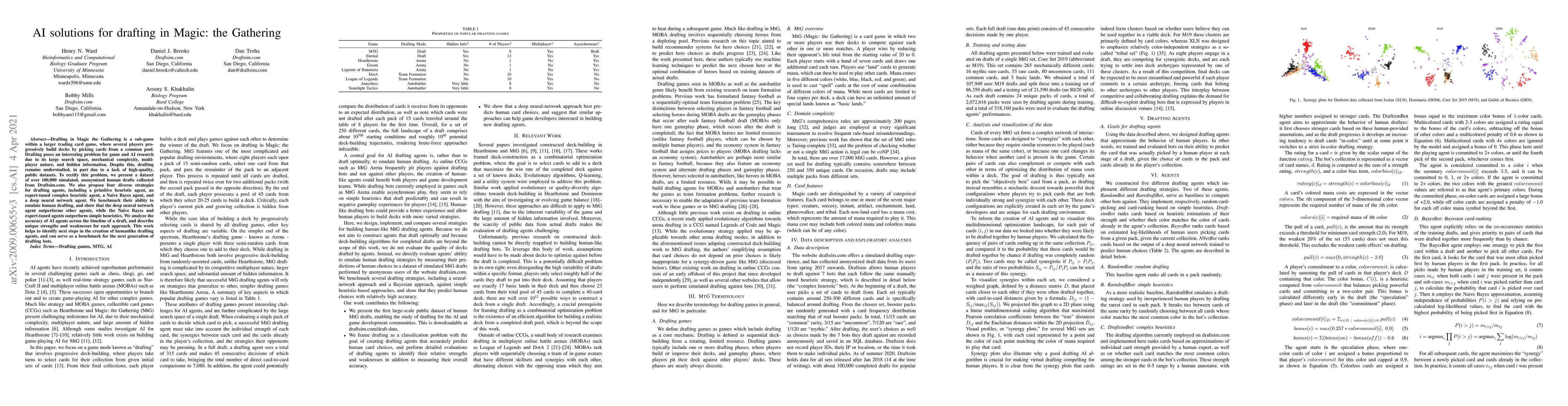 The research presents a dataset of over 100,000 simulated human drafts from Draftsim.com and proposes four drafting agents: a primitive heuristic, an expert-tuned complex heuristic, a Naive Bayes agent, and a deep neural network agent. These agents are benchmarked against human drafting behavior.