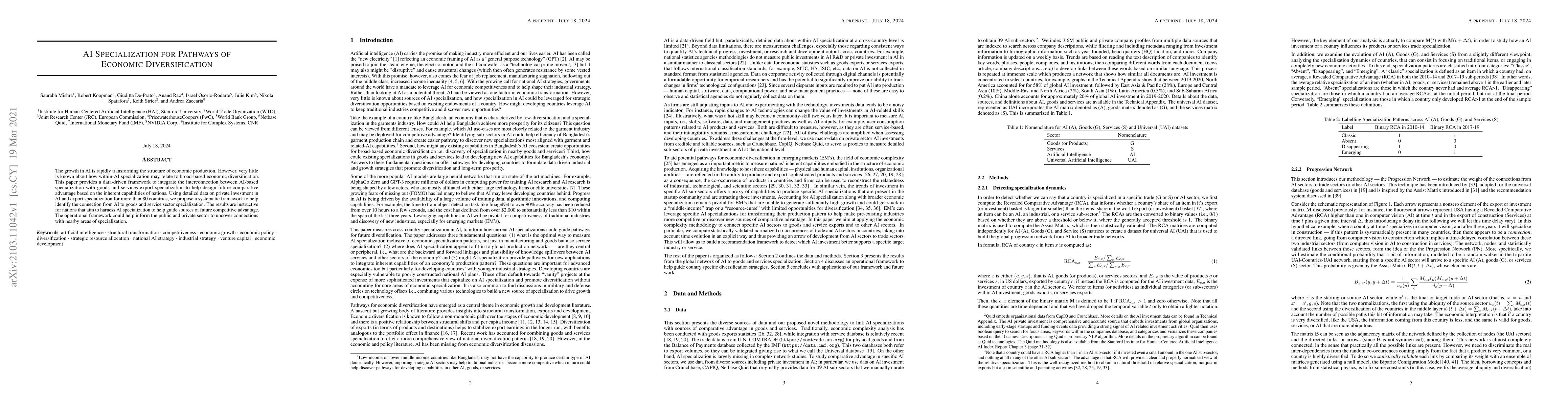 The growth in AI is rapidly transforming the structure of economic production. However, very little is known about how within-AI specialization may relate to broad-based economic diversification. This paper provides a data-driven framework to integrate the interconnection between AI-based specialization with goods and services export specialization to help design future comparative advantage based on the inherent capabilities of nations. Using detailed data on private investment in AI and export specialization for more than 80 countries, we propose a systematic framework to help identify the connection from AI to goods and service sector specialization. The results are instructive for nations that aim to harness AI specialization to help guide sources of future competitive advantage. The operational framework could help inform the public and private sector to uncover connections with nearby areas of specialization.