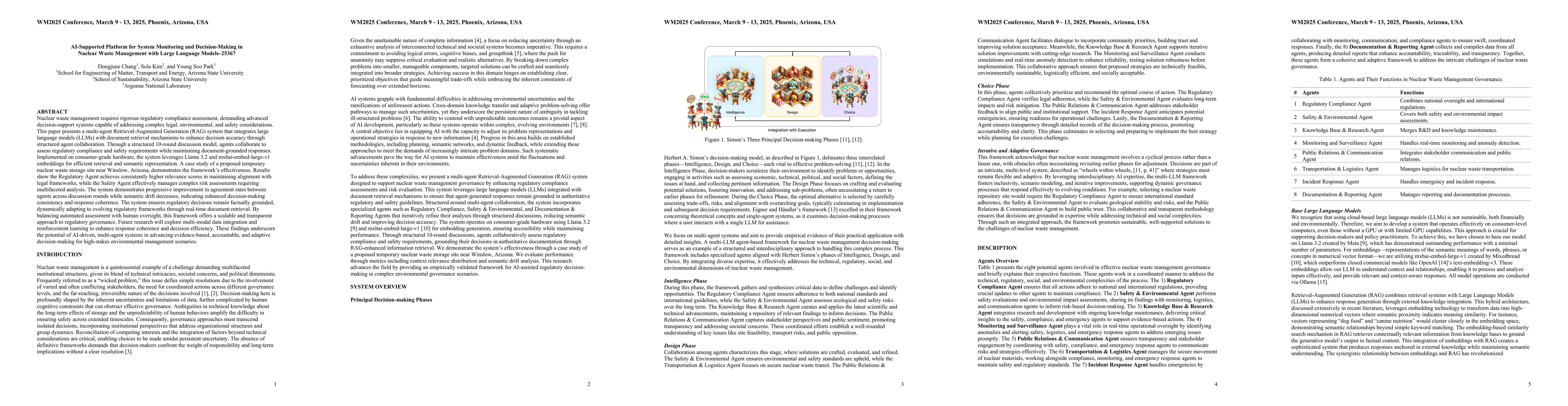 The research employs a multi-agent Retrieval-Augmented Generation (RAG) system integrating large language models (LLMs) with document retrieval mechanisms for decision support in nuclear waste management, implemented on consumer-grade hardware using Llama 3.2 and mxbai-embed-large-v1 embeddings.