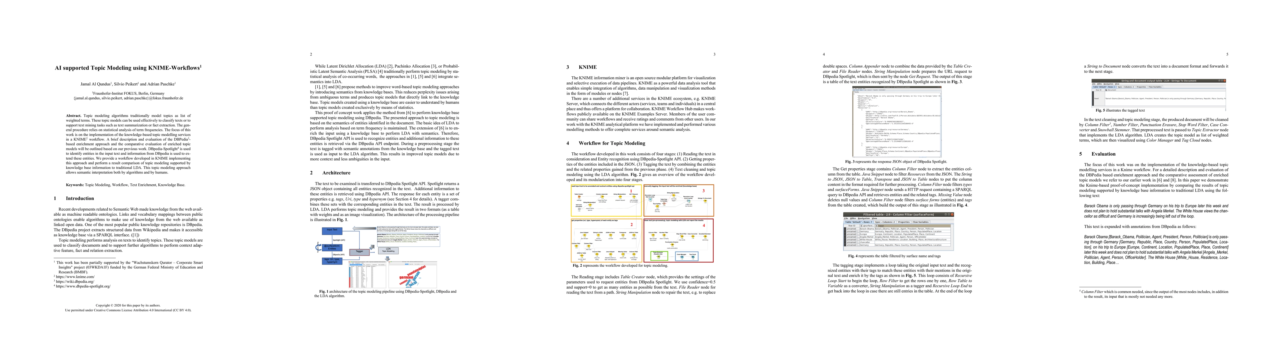 Topic modeling algorithms traditionally model topics as list of weighted terms. These topic models can be used effectively to classify texts or to support text mining tasks such as text summarization or fact extraction. The general procedure relies on statistical analysis of term frequencies. The focus of this work is on the implementation of the knowledge-based topic modelling services in a KNIME workflow. A brief description and evaluation of the DBPedia-based enrichment approach and the comparative evaluation of enriched topic models will be outlined based on our previous work. DBpedia-Spotlight is used to identify entities in the input text and information from DBpedia is used to extend these entities. We provide a workflow developed in KNIME implementing this approach and perform a result comparison of topic modeling supported by knowledge base information to traditional LDA. This topic modeling approach allows semantic interpretation both by algorithms and by humans.