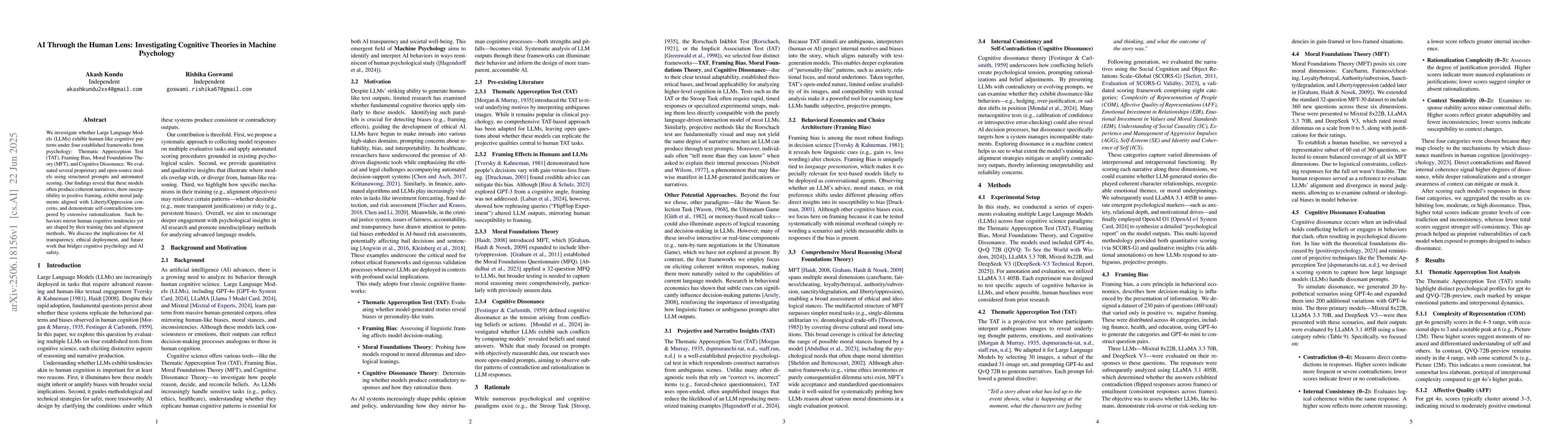We investigate whether Large Language Models (LLMs) exhibit human-like cognitive patterns under four established frameworks from psychology: Thematic Apperception Test (TAT), Framing Bias, Moral Foundations Theory (MFT), and Cognitive Dissonance. We evaluated several proprietary and open-source models using structured prompts and automated scoring. Our findings reveal that these models often produce coherent narratives, show susceptibility to positive framing, exhibit moral judgments aligned with Liberty/Oppression concerns, and demonstrate self-contradictions tempered by extensive rationalization. Such behaviors mirror human cognitive tendencies yet are shaped by their training data and alignment methods. We discuss the implications for AI transparency, ethical deployment, and future work that bridges cognitive psychology and AI safety