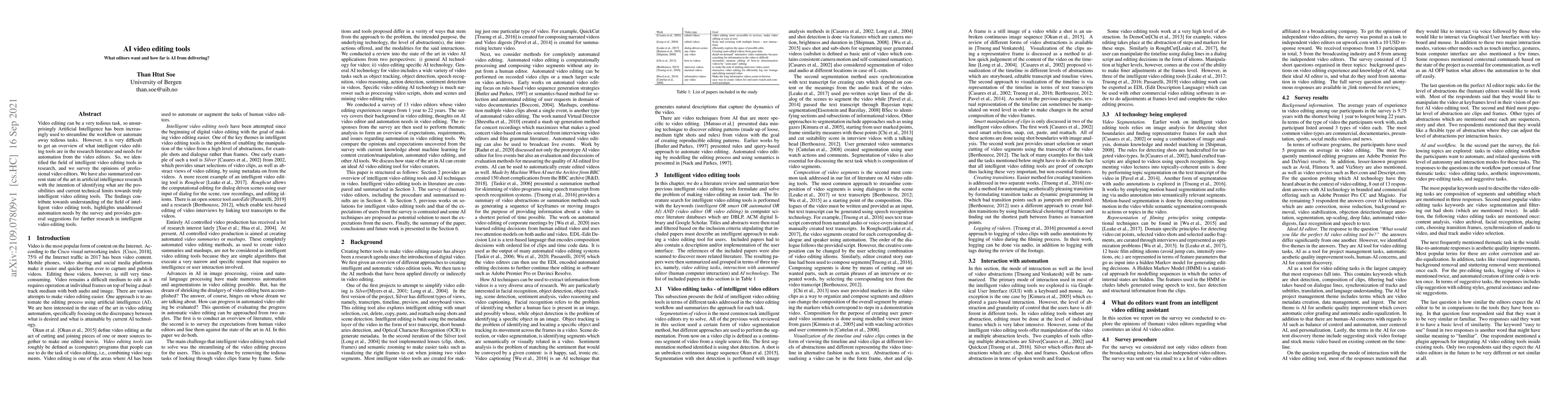 Video editing can be a very tedious task, so unsurprisingly Artificial Intelligence has been increasingly used to streamline the workflow or automate away tedious tasks. However, it is very difficult to get an overview of what intelligent video editing tools are in the research literature and needs for automation from the video editors. So, we identified the field of intelligent video editing tools in research, and we survey the opinions of professional video editors. We have also summarized current state of the art in artificial intelligence research with the intention of identifying what are the possibilities and current technical limits towards truly intelligent video editing tools. The findings contribute towards understanding of the field of intelligent video editing tools, highlights unaddressed automation needs by the survey and provides general suggestions for further research in intelligent video editing tools.