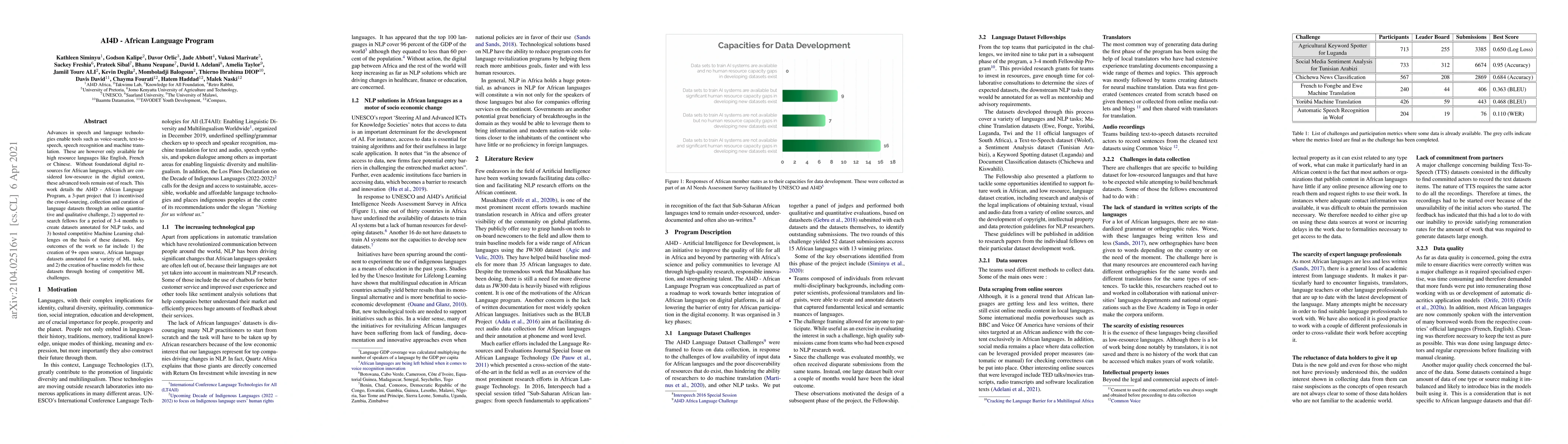 The AI4D African Language Program aims to develop foundational digital resources for African languages by crowdsourcing datasets and supporting research fellows to create annotated datasets for NLP tasks. The initiative has produced over 9 open-source datasets and baseline models through competitive machine learning challenges.