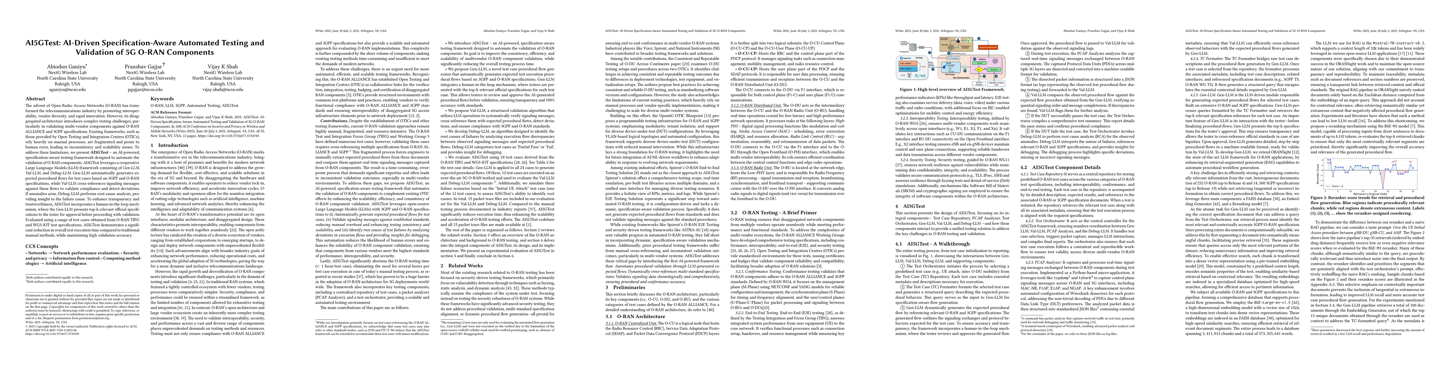 The advent of Open Radio Access Networks (O-RAN) has transformed the telecommunications industry by promoting interoperability, vendor diversity, and rapid innovation. However, its disaggregated architecture introduces complex testing challenges, particularly in validating multi-vendor components against O-RAN ALLIANCE and 3GPP specifications. Existing frameworks, such as those provided by Open Testing and Integration Centres (OTICs), rely heavily on manual processes, are fragmented and prone to human error, leading to inconsistency and scalability issues. To address these limitations, we present AI5GTest -- an AI-powered, specification-aware testing framework designed to automate the validation of O-RAN components. AI5GTest leverages a cooperative Large Language Models (LLM) framework consisting of Gen-LLM, Val-LLM, and Debug-LLM. Gen-LLM automatically generates expected procedural flows for test cases based on 3GPP and O-RAN specifications, while Val-LLM cross-references signaling messages against these flows to validate compliance and detect deviations. If anomalies arise, Debug-LLM performs root cause analysis, providing insight to the failure cause. To enhance transparency and trustworthiness, AI5GTest incorporates a human-in-the-loop mechanism, where the Gen-LLM presents top-k relevant official specifications to the tester for approval before proceeding with validation. Evaluated using a range of test cases obtained from O-RAN TIFG and WG5-IOT test specifications, AI5GTest demonstrates a significant reduction in overall test execution time compared to traditional manual methods, while maintaining high validation accuracy.