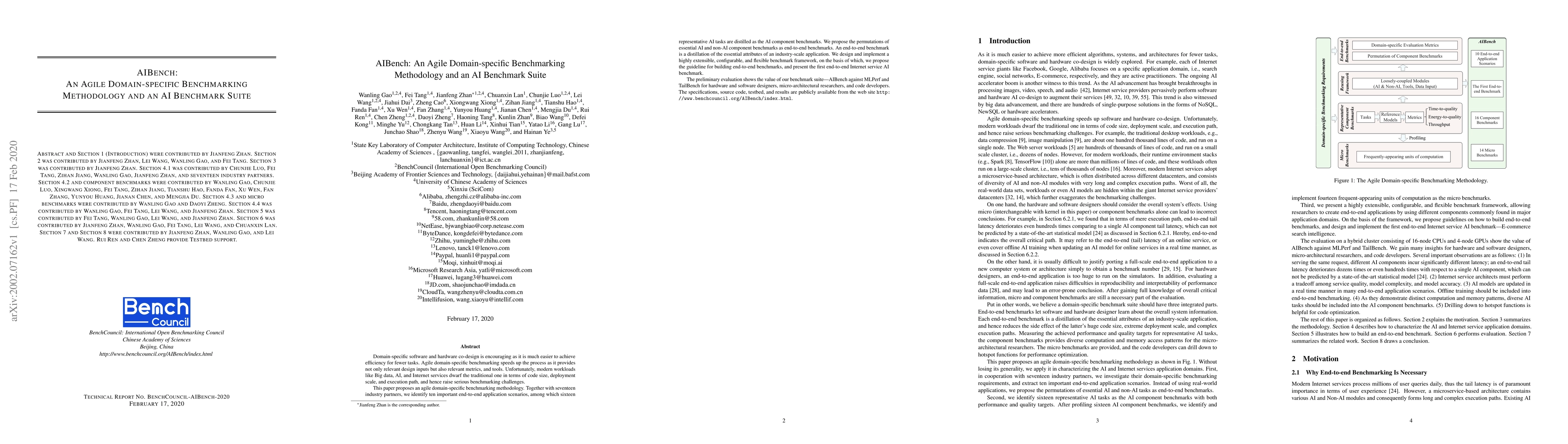 This paper introduces AIBench, an agile domain-specific benchmarking methodology and suite, designed to address the challenges of modern AI workloads. It proposes a framework for creating end-to-end benchmarks based on industry scenarios, demonstrating its value through preliminary evaluations against existing benchmarks.