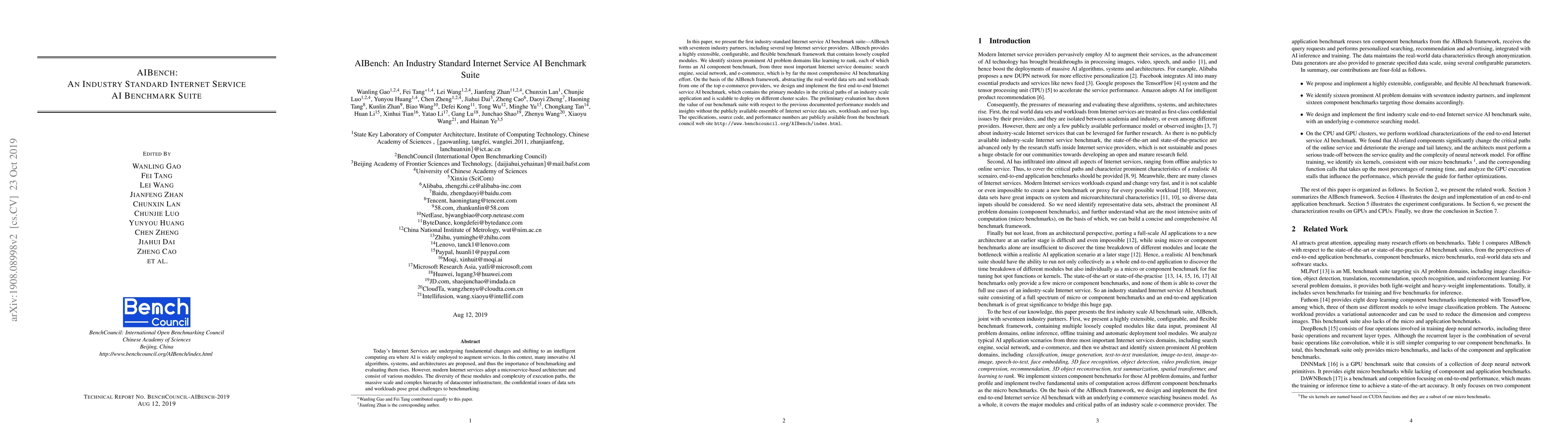 AIBench is an industry-standard AI benchmark suite developed by seventeen partners, including top Internet service providers, to evaluate AI algorithms in microservice-based Internet services. It offers a comprehensive framework covering sixteen AI problem domains across search, social networks, and e-commerce, and is designed to be scalable and flexible.