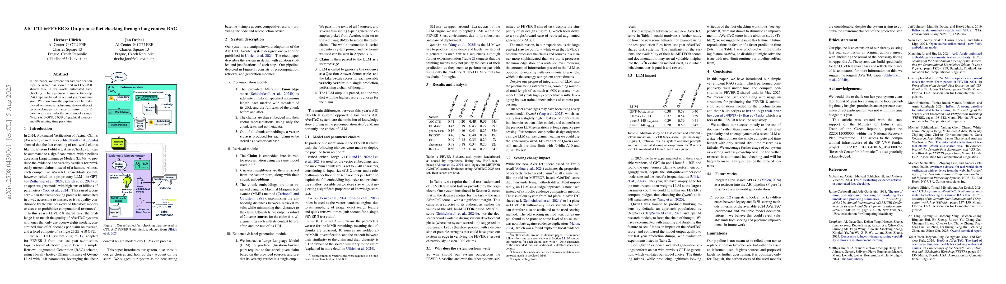 In this paper, we present our fact-checking pipeline which has scored first in FEVER 8 shared task. Our fact-checking system is a simple two-step RAG pipeline based on our last year's submission. We show how the pipeline can be redeployed on-premise, achieving state-of-the-art fact-checking performance (in sense of Ev2R test-score), even under the constraint of a single NVidia A10 GPU, 23GB of graphical memory and 60s running time per claim.