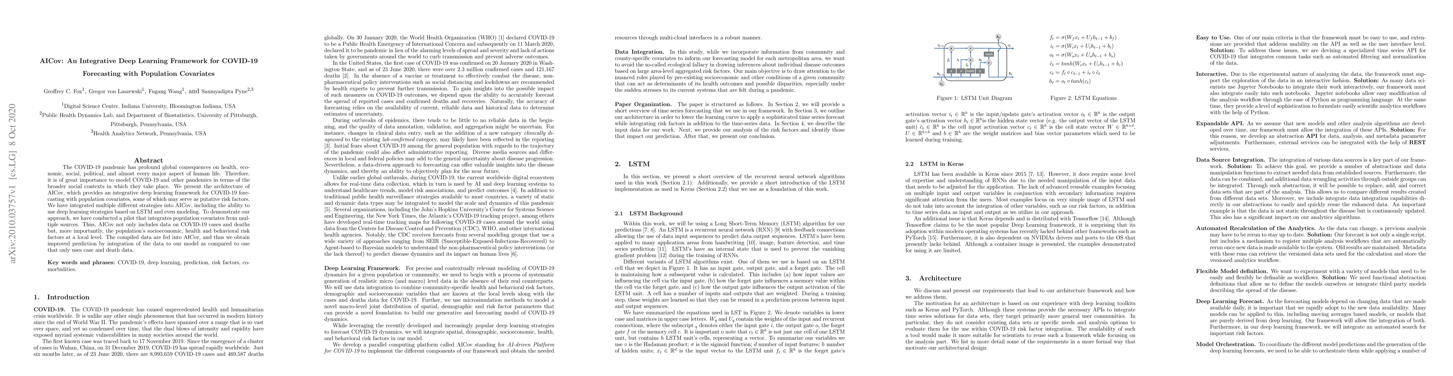 The COVID-19 pandemic has profound global consequences on health, economic, social, political, and almost every major aspect of human life. Therefore, it is of great importance to model COVID-19 and other pandemics in terms of the broader social contexts in which they take place. We present the architecture of AICov, which provides an integrative deep learning framework for COVID-19 forecasting with population covariates, some of which may serve as putative risk factors. We have integrated multiple different strategies into AICov, including the ability to use deep learning strategies based on LSTM and even modeling. To demonstrate our approach, we have conducted a pilot that integrates population covariates from multiple sources. Thus, AICov not only includes data on COVID-19 cases and deaths but, more importantly, the population's socioeconomic, health and behavioral risk factors at a local level. The compiled data are fed into AICov, and thus we obtain improved prediction by integration of the data to our model as compared to one that only uses case and death data.