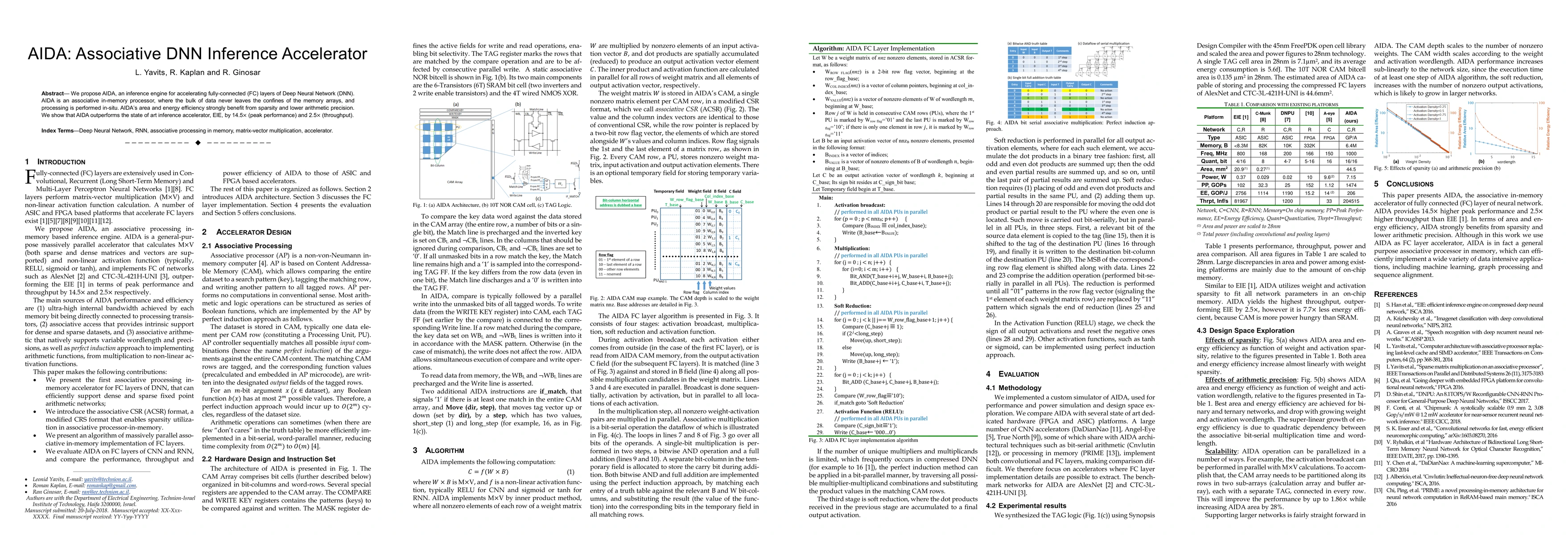 Summary: AIDA is an innovative in-memory associative processor designed to accelerate fully-connected layers in DNNs, offering significant improvements in both peak performance and throughput over existing accelerators, leveraging sparsity and lower precision for enhanced efficiency.
