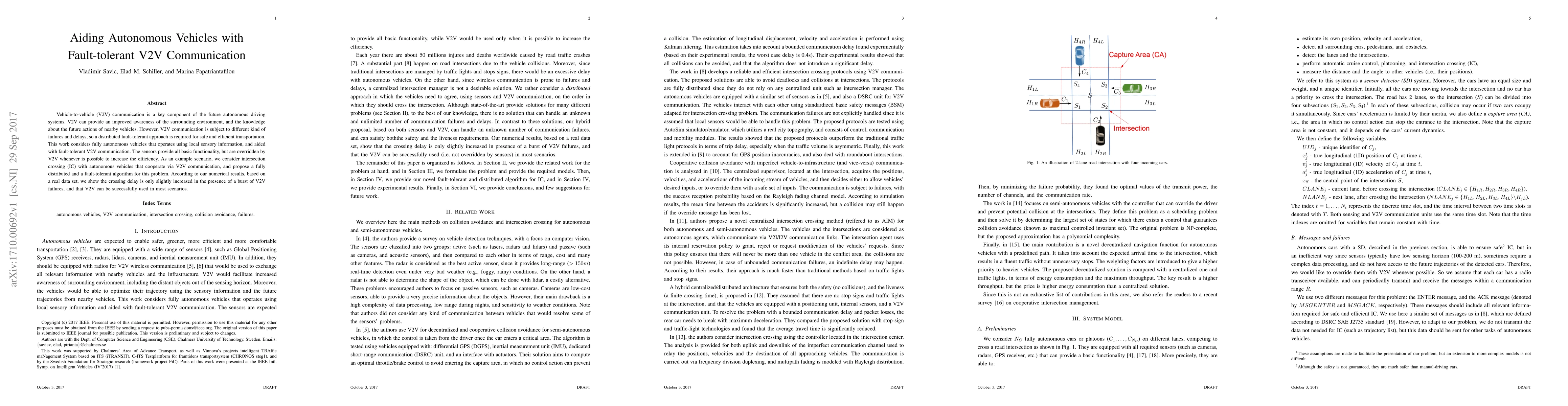 Vehicle-to-vehicle (V2V) communication is a key component of the future autonomous driving systems. V2V can provide an improved awareness of the surrounding environment, and the knowledge about the future actions of nearby vehicles. However, V2V communication is subject to different kind of failures and delays, so a distributed fault-tolerant approach is required for safe and efficient transportation. This work considers fully autonomous vehicles that operates using local sensory information, and aided with fault-tolerant V2V communication. The sensors provide all basic functionality, but are overridden by V2V whenever is possible to increase the efficiency. As an example scenario, we consider intersection crossing (IC) with autonomous vehicles that cooperate via V2V communication, and propose a fully distributed and a fault-tolerant algorithm for this problem. According to our numerical results, based on a real data set, we show the crossing delay is only slightly increased in the presence of a burst of V2V failures, and that V2V can be successfully used in most scenarios.