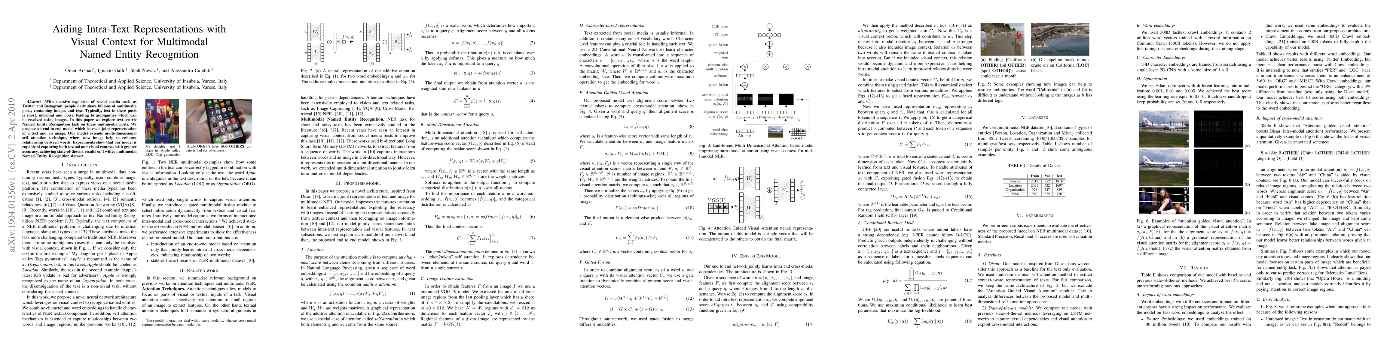 This paper proposes an end-to-end model for multimodal Named Entity Recognition in short, noisy social media texts, integrating visual context from images to enhance text representations. The model employs an extended self-attention technique, achieving state-of-the-art results on a Twitter dataset.