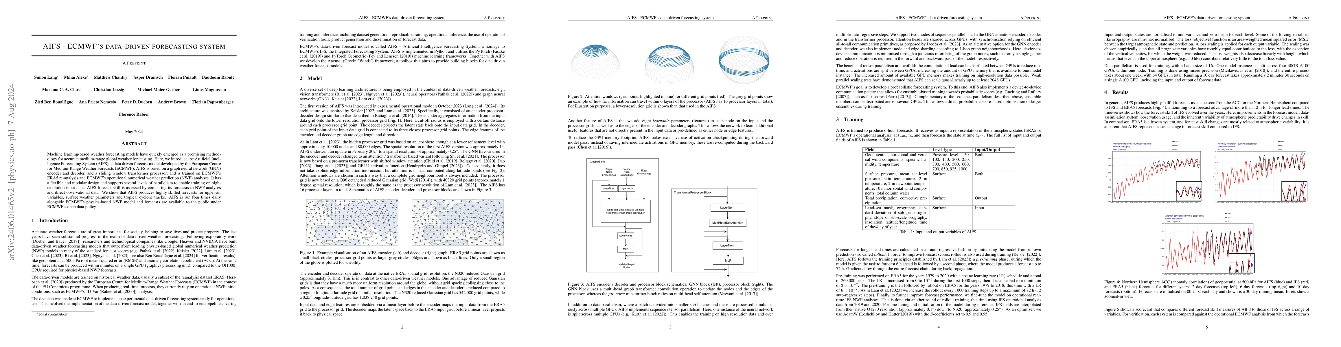 The ECMWF's Artificial Intelligence Forecasting System (AIFS) employs a graph neural network and transformer architecture to provide accurate medium-range global weather forecasts, outperforming traditional models in upper-air variables, surface weather parameters, and tropical cyclone tracks. AIFS is integrated into ECMWF's operational workflow and provides public forecasts under an open data policy.