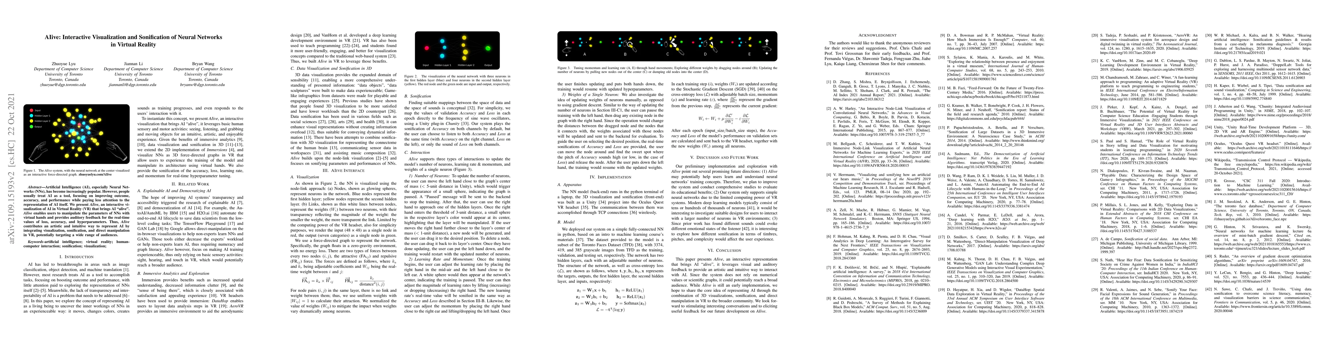 AIive is an interactive VR system that visualizes and sonifies neural networks, allowing users to manipulate network parameters with virtual hands and receive auditory feedback for real-time metrics, offering an artistic and intuitive representation of AI. This approach aims to make AI more accessible and engaging for diverse audiences.