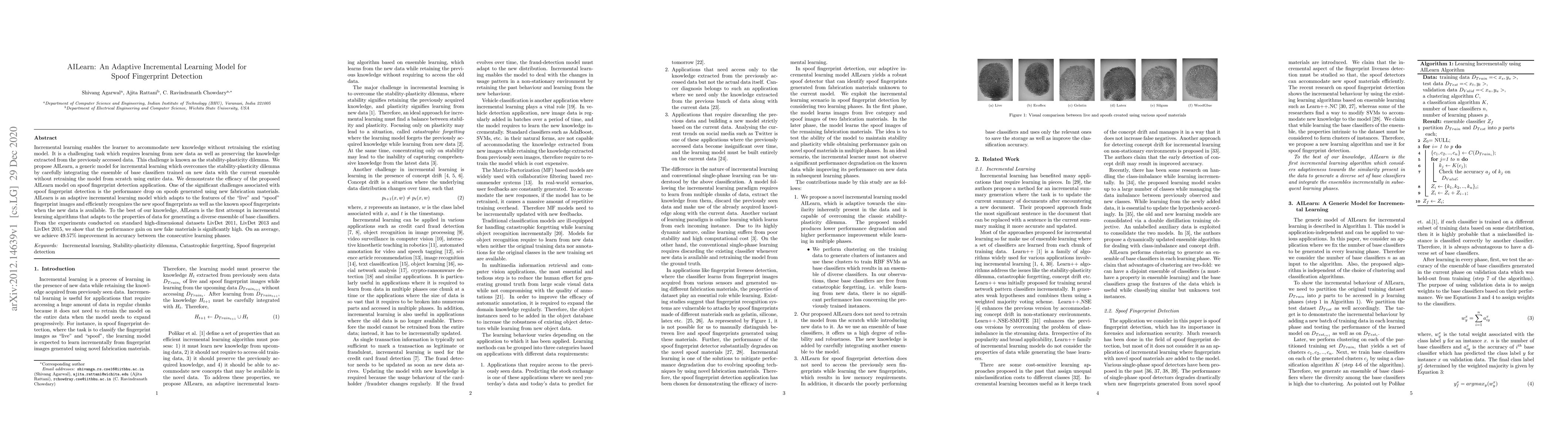 AILearn is an adaptive incremental learning model designed to address the stability-plasticity dilemma in spoof fingerprint detection, integrating new data without retraining the entire model. It demonstrates a significant performance improvement on new spoof materials, achieving an average accuracy gain of 49.57% across multiple datasets.