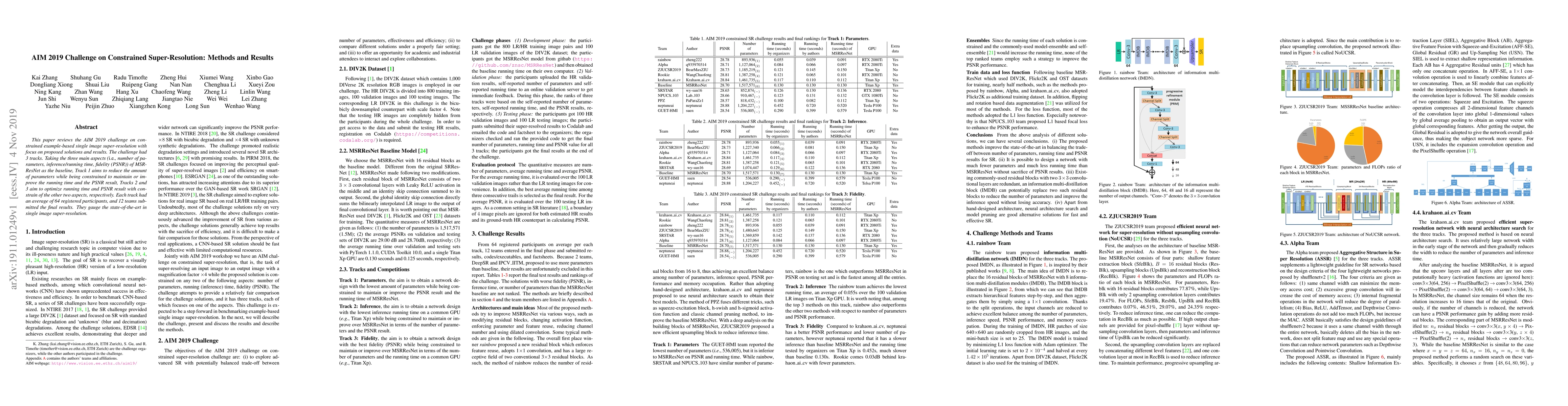 This paper reviews the AIM 2019 challenge on constrained example-based single image super-resolution with focus on proposed solutions and results. The challenge had 3 tracks. Taking the three main aspects (i.e., number of parameters, inference/running time, fidelity (PSNR)) of MSRResNet as the baseline, Track 1 aims to reduce the amount of parameters while being constrained to maintain or improve the running time and the PSNR result, Tracks 2 and 3 aim to optimize running time and PSNR result with constrain of the other two aspects, respectively. Each track had an average of 64 registered participants, and 12 teams submitted the final results. They gauge the state-of-the-art in single image super-resolution.