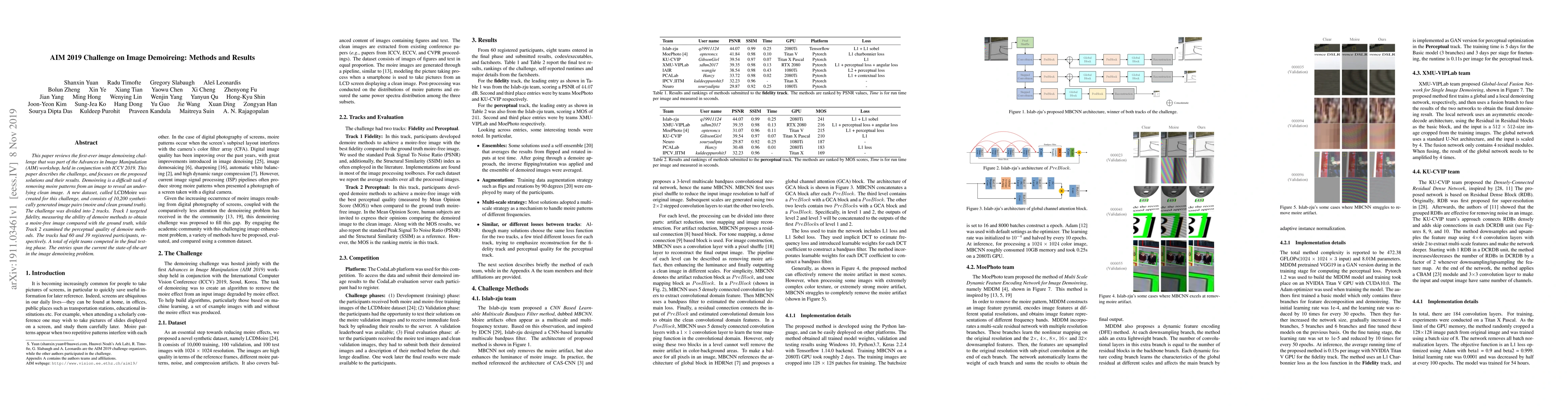 This paper reviews the AIM 2019 Challenge on image demoireing, which aimed to remove moire patterns from images. The challenge introduced a new dataset, LCDMoire, and had two tracks evaluating fidelity and perceptual quality, with 8 teams competing.