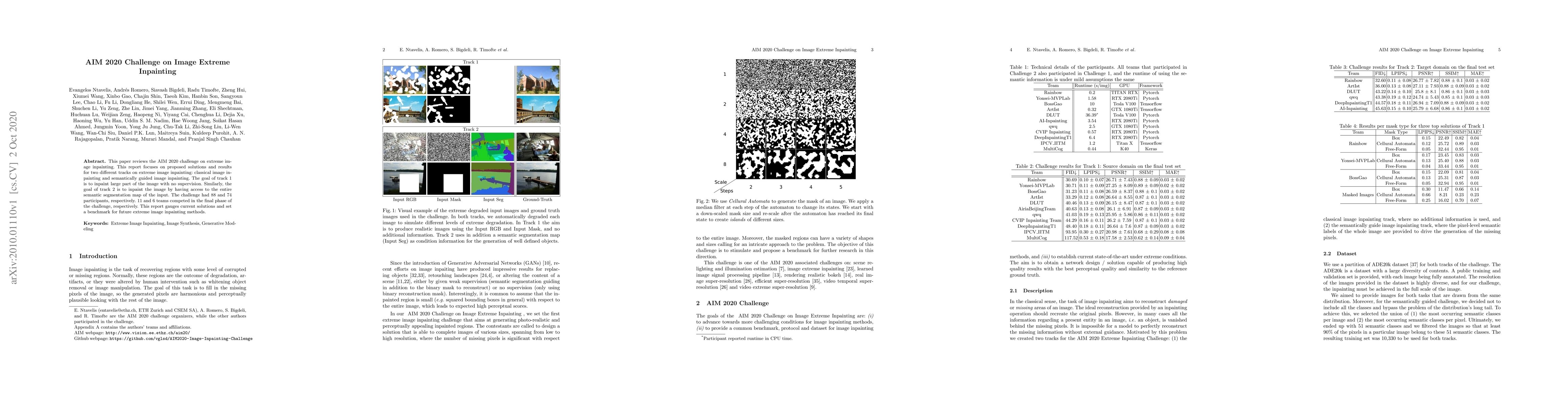 This paper reviews the AIM 2020 challenge on extreme image inpainting, focusing on solutions for two tracks: classical and semantically guided inpainting. The challenge set benchmarks for future methods, with 88 and 74 participants respectively, and 11 and 6 teams advancing to the final phase.