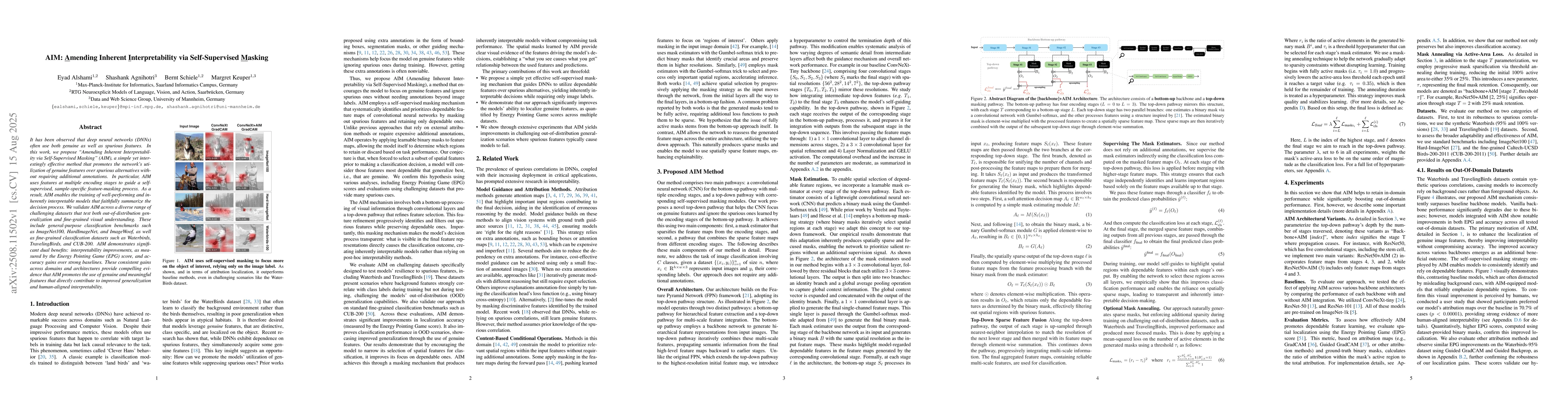 It has been observed that deep neural networks (DNNs) often use both genuine as well as spurious features. In this work, we propose "Amending Inherent Interpretability via Self-Supervised Masking" (AIM), a simple yet interestingly effective method that promotes the network's utilization of genuine features over spurious alternatives without requiring additional annotations. In particular, AIM uses features at multiple encoding stages to guide a self-supervised, sample-specific feature-masking process. As a result, AIM enables the training of well-performing and inherently interpretable models that faithfully summarize the decision process. We validate AIM across a diverse range of challenging datasets that test both out-of-distribution generalization and fine-grained visual understanding. These include general-purpose classification benchmarks such as ImageNet100, HardImageNet, and ImageWoof, as well as fine-grained classification datasets such as Waterbirds, TravelingBirds, and CUB-200. AIM demonstrates significant dual benefits: interpretability improvements, as measured by the Energy Pointing Game (EPG) score, and accuracy gains over strong baselines. These consistent gains across domains and architectures provide compelling evidence that AIM promotes the use of genuine and meaningful features that directly contribute to improved generalization and human-aligned interpretability.