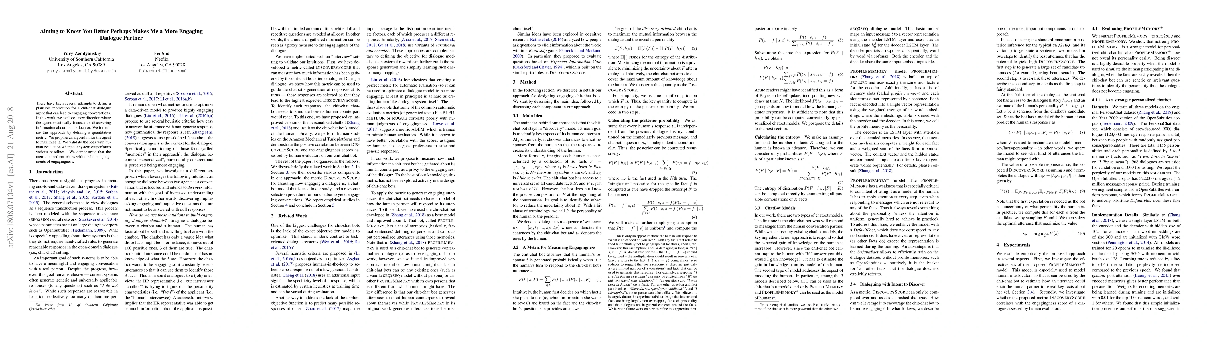 There have been several attempts to define a plausible motivation for a chit-chat dialogue agent that can lead to engaging conversations. In this work, we explore a new direction where the agent specifically focuses on discovering information about its interlocutor. We formalize this approach by defining a quantitative metric. We propose an algorithm for the agent to maximize it. We validate the idea with human evaluation where our system outperforms various baselines. We demonstrate that the metric indeed correlates with the human judgments of engagingness.