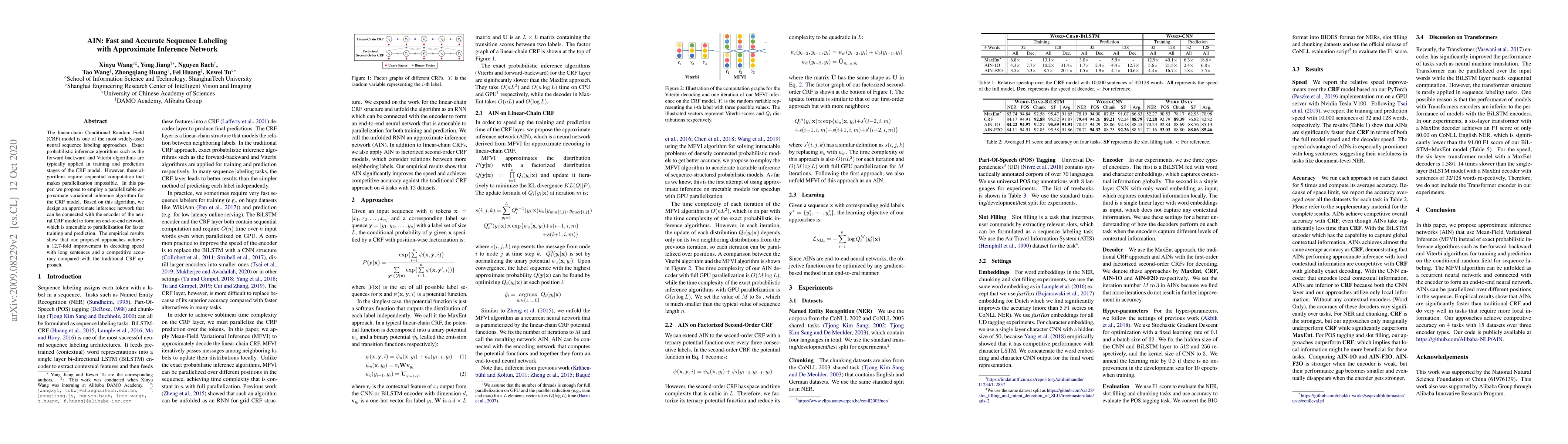 The linear-chain Conditional Random Field (CRF) model is one of the most widely-used neural sequence labeling approaches. Exact probabilistic inference algorithms such as the forward-backward and Viterbi algorithms are typically applied in training and prediction stages of the CRF model. However, these algorithms require sequential computation that makes parallelization impossible. In this paper, we propose to employ a parallelizable approximate variational inference algorithm for the CRF model. Based on this algorithm, we design an approximate inference network that can be connected with the encoder of the neural CRF model to form an end-to-end network, which is amenable to parallelization for faster training and prediction. The empirical results show that our proposed approaches achieve a 12.7-fold improvement in decoding speed with long sentences and a competitive accuracy compared with the traditional CRF approach.
