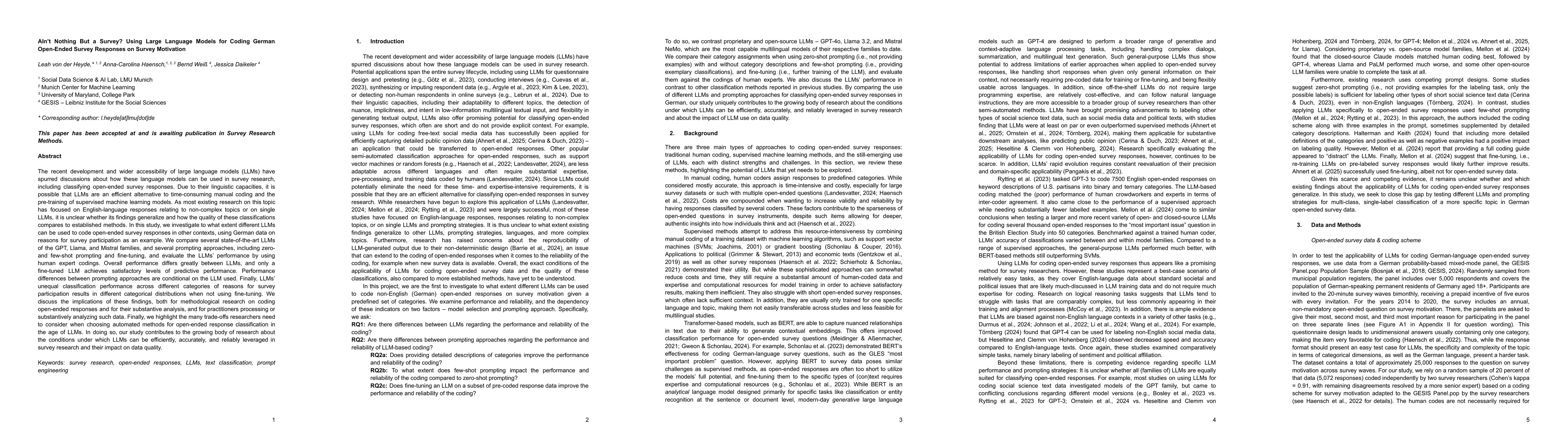 The recent development and wider accessibility of LLMs have spurred discussions about how they can be used in survey research, including classifying open-ended survey responses. Due to their linguistic capacities, it is possible that LLMs are an efficient alternative to time-consuming manual coding and the pre-training of supervised machine learning models. As most existing research on this topic has focused on English-language responses relating to non-complex topics or on single LLMs, it is unclear whether its findings generalize and how the quality of these classifications compares to established methods. In this study, we investigate to what extent different LLMs can be used to code open-ended survey responses in other contexts, using German data on reasons for survey participation as an example. We compare several state-of-the-art LLMs and several prompting approaches, and evaluate the LLMs' performance by using human expert codings. Overall performance differs greatly between LLMs, and only a fine-tuned LLM achieves satisfactory levels of predictive performance. Performance differences between prompting approaches are conditional on the LLM used. Finally, LLMs' unequal classification performance across different categories of reasons for survey participation results in different categorical distributions when not using fine-tuning. We discuss the implications of these findings, both for methodological research on coding open-ended responses and for their substantive analysis, and for practitioners processing or substantively analyzing such data. Finally, we highlight the many trade-offs researchers need to consider when choosing automated methods for open-ended response classification in the age of LLMs. In doing so, our study contributes to the growing body of research about the conditions under which LLMs can be efficiently, accurately, and reliably leveraged in survey research.