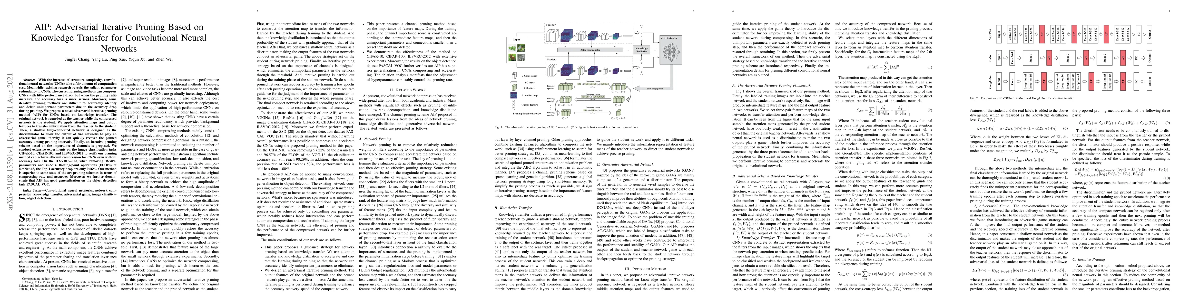 The paper proposes AIP, an adversarial iterative pruning method for CNNs that leverages knowledge transfer from a teacher network to a student network, using attention maps and output features. This method effectively compresses CNNs with minimal accuracy loss, demonstrated through experiments on CIFAR and ILSVRC datasets, showing a 0.66% accuracy drop after removing 36.78% parameters in ResNet-18.