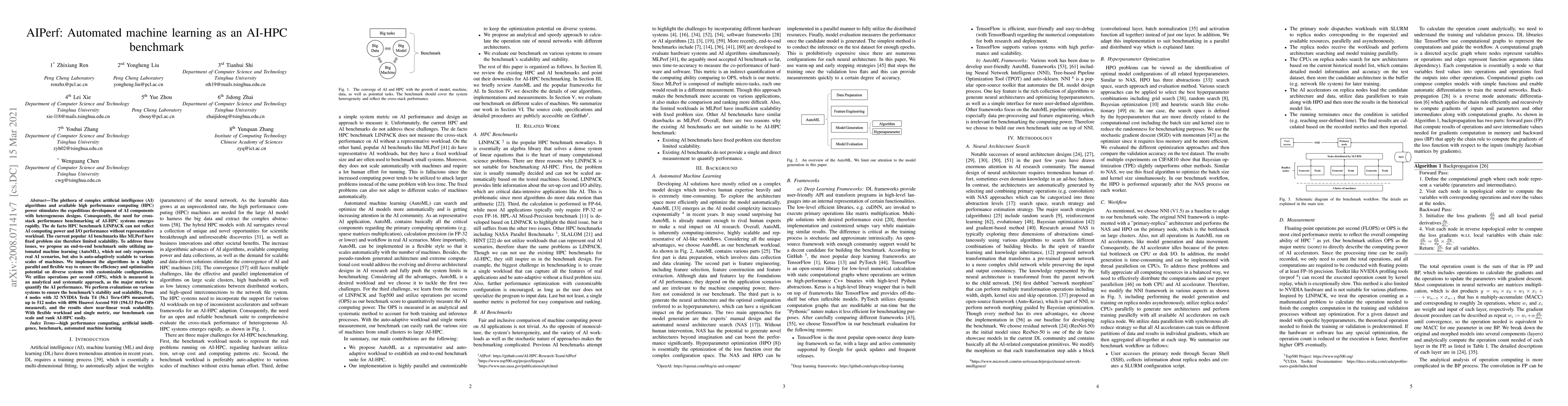 The paper proposes AIPerf, an end-to-end automated machine learning benchmark to evaluate AI-HPC systems, addressing limitations of existing benchmarks like LINPACK and MLPerf. It measures performance through operations per second (OPS) and demonstrates scalability across various systems, showing near-linear weak scalability from 4 to 512 nodes.