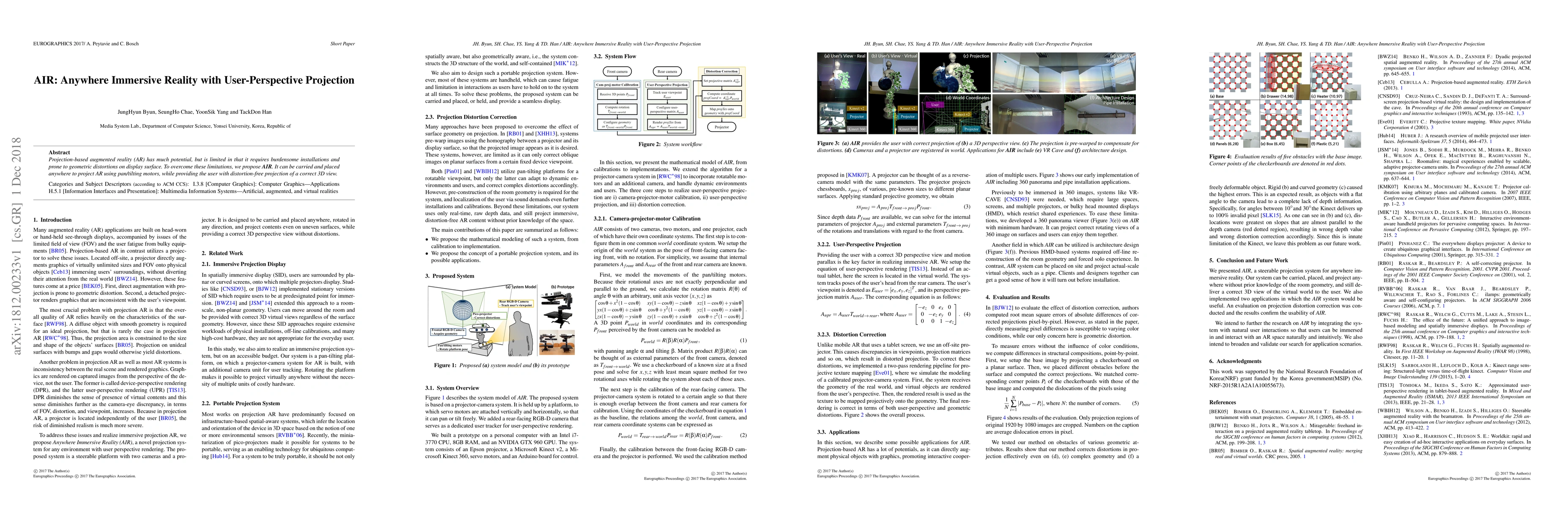 Summary: The paper introduces AIR, a portable projection-based augmented reality system that eliminates installation burdens and geometric distortions by using pan/tilting motors to provide users with distortion-free, correct 3D views anywhere.