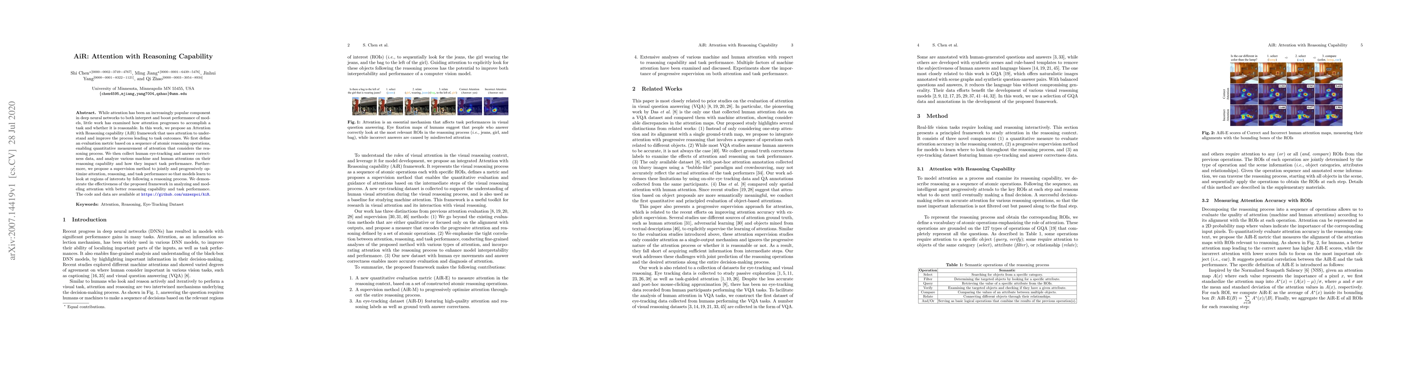While attention has been an increasingly popular component in deep neural networks to both interpret and boost performance of models, little work has examined how attention progresses to accomplish a task and whether it is reasonable. In this work, we propose an Attention with Reasoning capability (AiR) framework that uses attention to understand and improve the process leading to task outcomes. We first define an evaluation metric based on a sequence of atomic reasoning operations, enabling quantitative measurement of attention that considers the reasoning process. We then collect human eye-tracking and answer correctness data, and analyze various machine and human attentions on their reasoning capability and how they impact task performance. Furthermore, we propose a supervision method to jointly and progressively optimize attention, reasoning, and task performance so that models learn to look at regions of interests by following a reasoning process. We demonstrate the effectiveness of the proposed framework in analyzing and modeling attention with better reasoning capability and task performance. The code and data are available at https://github.com/szzexpoi/AiR