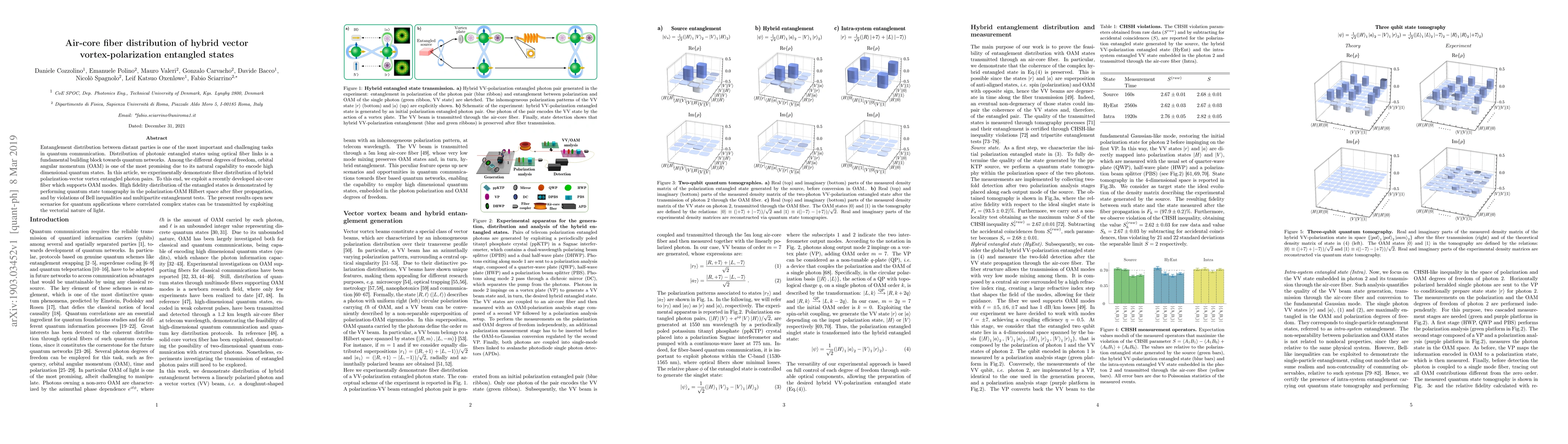 This paper experimentally demonstrates the high fidelity distribution of hybrid polarization-vector vortex entangled photon pairs using air-core fiber that supports orbital angular momentum modes. The study validates the technique through quantum state tomography and Bell inequality violations, paving the way for advanced quantum communication applications.