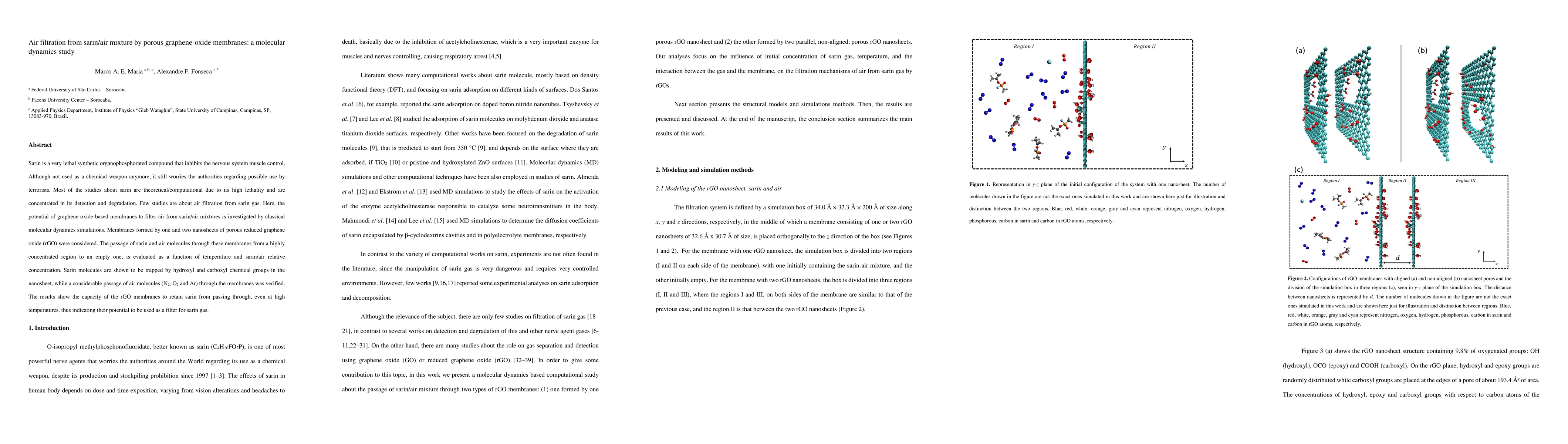 This study uses molecular dynamics simulations to demonstrate that porous graphene-oxide membranes can effectively filter sarin gas from air mixtures, retaining sarin molecules while allowing air components like N2, O2, and Ar to pass through, even at high temperatures.
