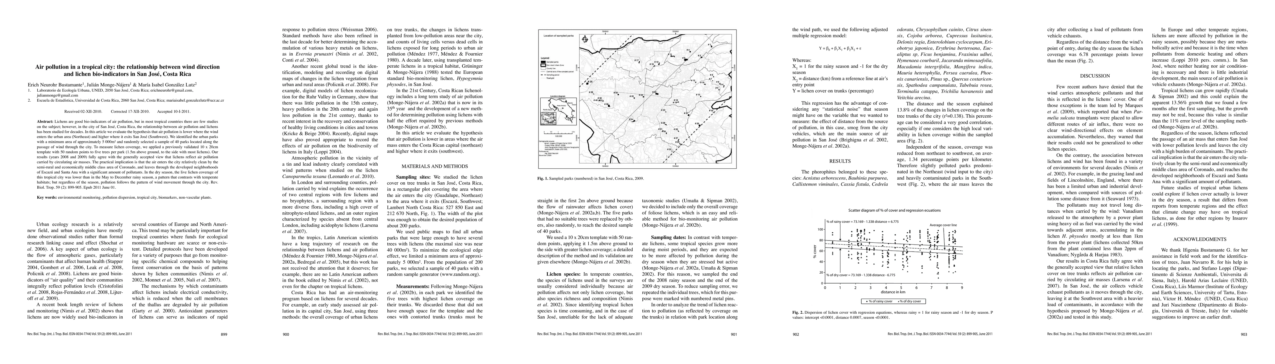 This study investigates the relationship between wind direction and lichen bio-indicators in San José, Costa Rica, finding that lichen coverage reflects air pollution levels. The results show lower lichen coverage in the southwest, where air exits the city, indicating higher pollution, compared to the northeast, where cleaner air enters.