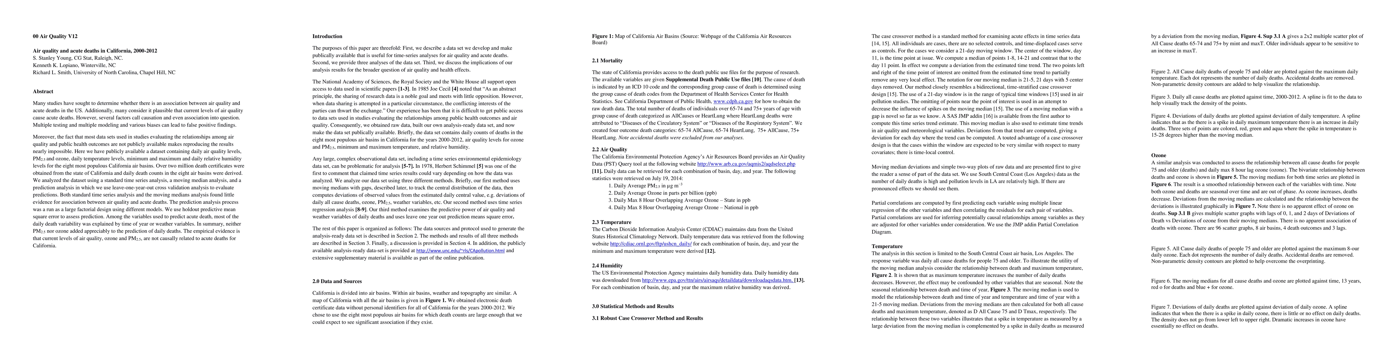 Many studies have sought to determine if there is an association between air quality and acute deaths. Many consider it plausible that current levels of air quality cause acute deaths. However, several factors call causation and even association into question. Observational data sets are large and complex. Multiple testing and multiple modeling can lead to false positive findings. Publication, confirmation and other biases are also possible problems. Moreover, the fact that most data sets used in studies evaluating the relationships among air quality and public health outcomes are not publicly available makes reproducing the claims nearly impossible. Here we have built and made publicly available a dataset containing daily air quality levels, PM2.5 and ozone, daily temperature levels, minimum and maximum and daily relative humidity levels for the eight most populous California air basins. We analyzed the dataset using a moving median analysis, a standard time series analysis, and a prediction analysis within the following analysis strategy. We examine the eight air basins separately to see if estimates replicate across locations. We use leave one year out cross validation analysis to evaluate predictions. Both the moving medians analysis and the standard time series analysis found little evidence for association between air quality and acute deaths. The prediction analysis process was a run as a large factorial design using different models and holding out one year at a time. Among the variables used to predict acute death, most of the daily death variability was explained by time of year or weather variables. In summary, the empirical evidence is that current levels of air quality, ozone and PM2.5, are not causally related to acute deaths for California. An empirical and logical case can be made air quality is not causally related to acute deaths for the rest of the United States.