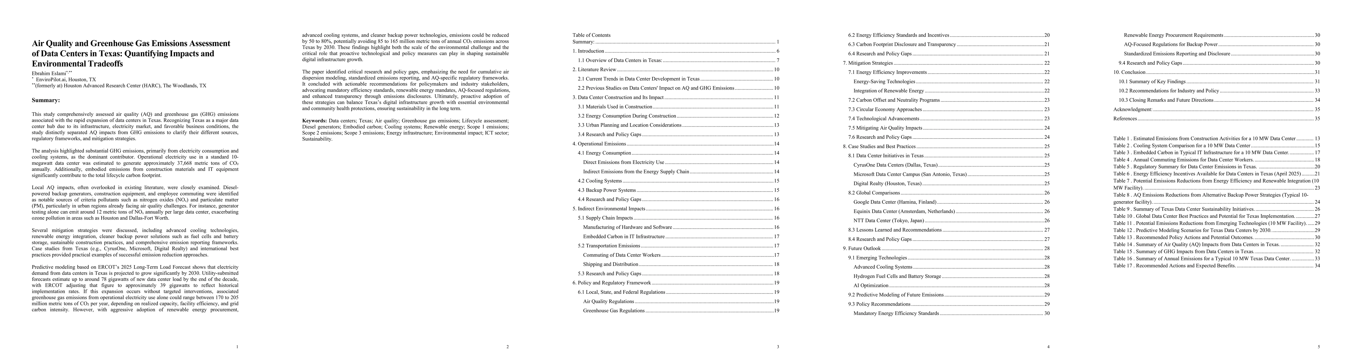 The research employed a comprehensive analysis of existing literature, case studies of data centers in Texas, and predictive modeling to assess both air quality (AQ) and greenhouse gas (GHG) emissions. It integrated data from public reports, industry benchmarks, and environmental impact assessments to quantify emission sources and mitigation strategies.