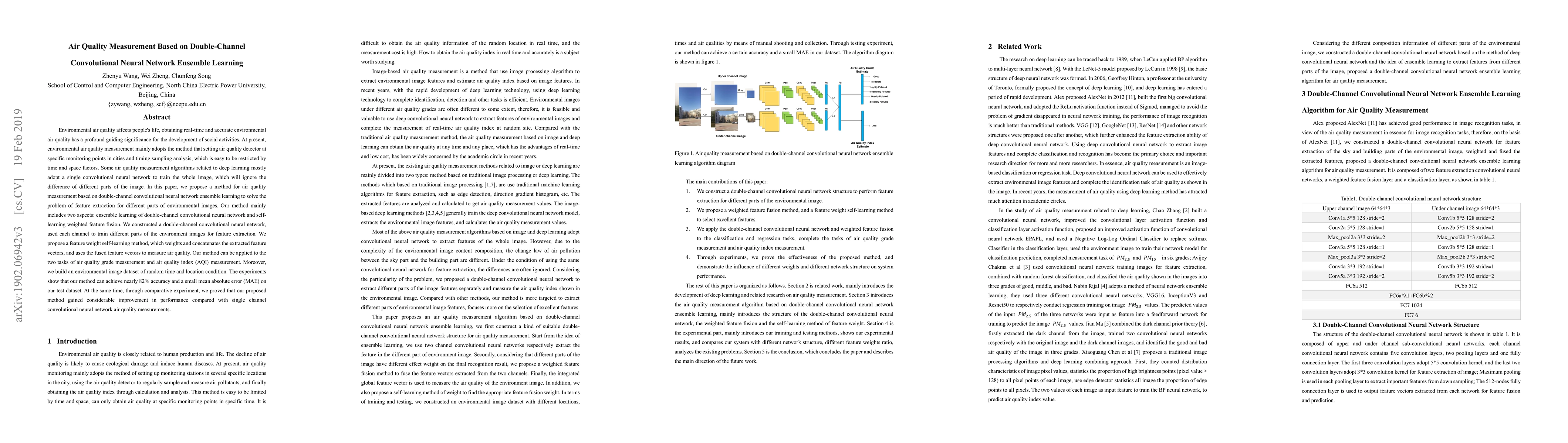 This paper proposes a double-channel convolutional neural network ensemble learning method for accurate air quality measurement, addressing the limitations of single-channel approaches. The method combines self-learning weighted feature fusion and achieves nearly 82% accuracy and a small mean absolute error, demonstrating significant improvement over single-channel CNNs.