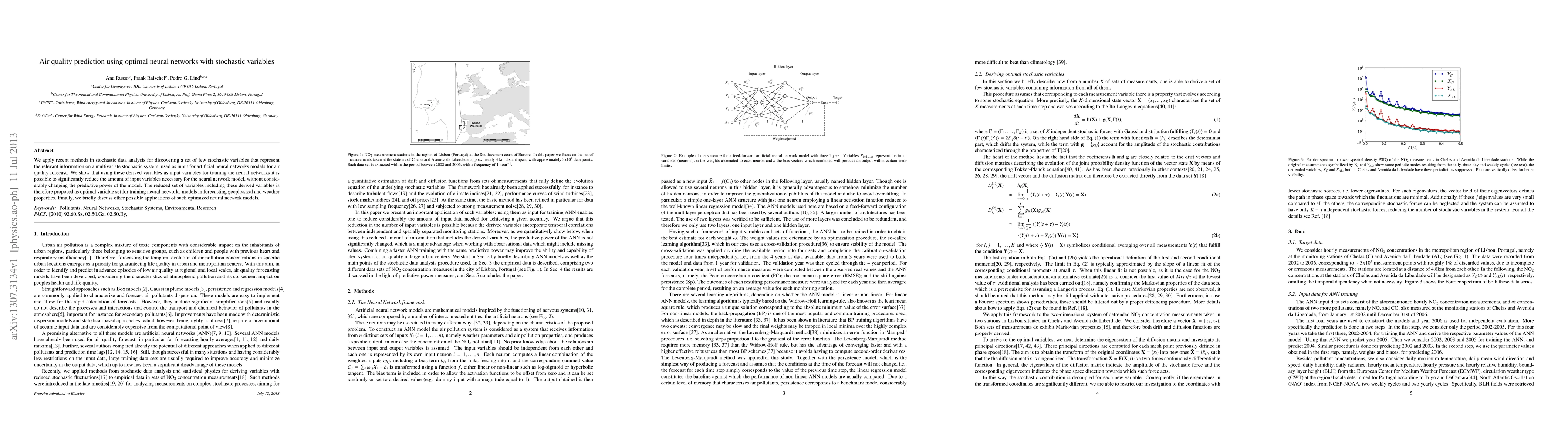We apply recent methods in stochastic data analysis for discovering a set of few stochastic variables that represent the relevant information on a multivariate stochastic system, used as input for artificial neural networks models for air quality forecast. We show that using these derived variables as input variables for training the neural networks it is possible to significantly reduce the amount of input variables necessary for the neural network model, without considerably changing the predictive power of the model. The reduced set of variables including these derived variables is therefore proposed as optimal variable set for training neural networks models in forecasting geophysical and weather properties. Finally, we briefly discuss other possible applications of such optimized neural network models.
