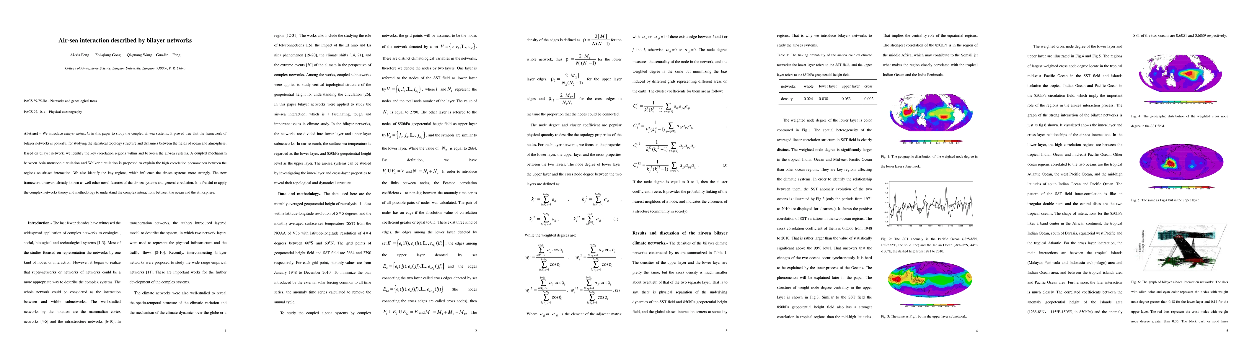 We introduce bilayer networks in this paper to study the coupled air-sea systems. It proved true that the framework of bilayer networks is powerful for studying the statistical topology structure and dynamics between the fields of ocean and atmosphere. Based on bilayer network, we identify the key correlation regions within and between the air-sea systems. A coupled mechanism between Asia monsoon circulation and Walker circulation is proposed to explain the high correlation phenomenon between the regions on air-sea interaction. We also identify the key regions, which influence the air-sea systems more strongly. The new framework uncovers already known as well other novel features of the air-sea systems and general circulation. It is fruitful to apply the complex networks theory and methodology to understand the complex interactions between the ocean and the atmosphere.